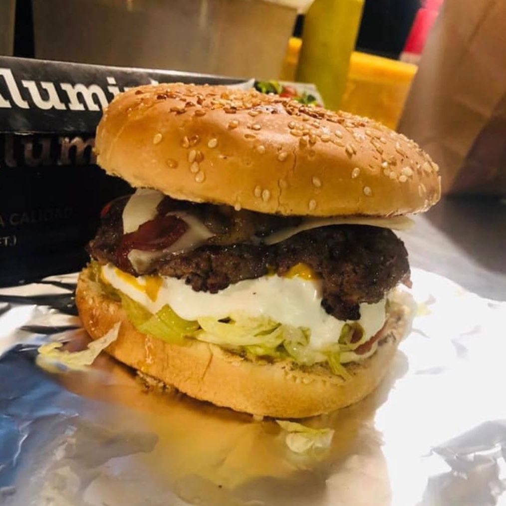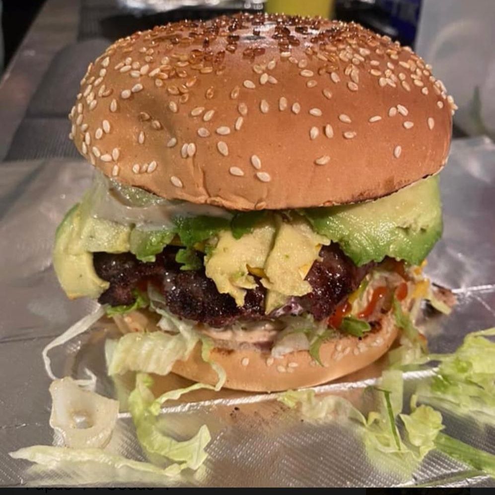 Pan parrillero, carne 100% de res con queso americano, tomate, lechuga, cebolla, catsup, mostaza y aderezo de la casa. salsa chipotle,chile california y tocino