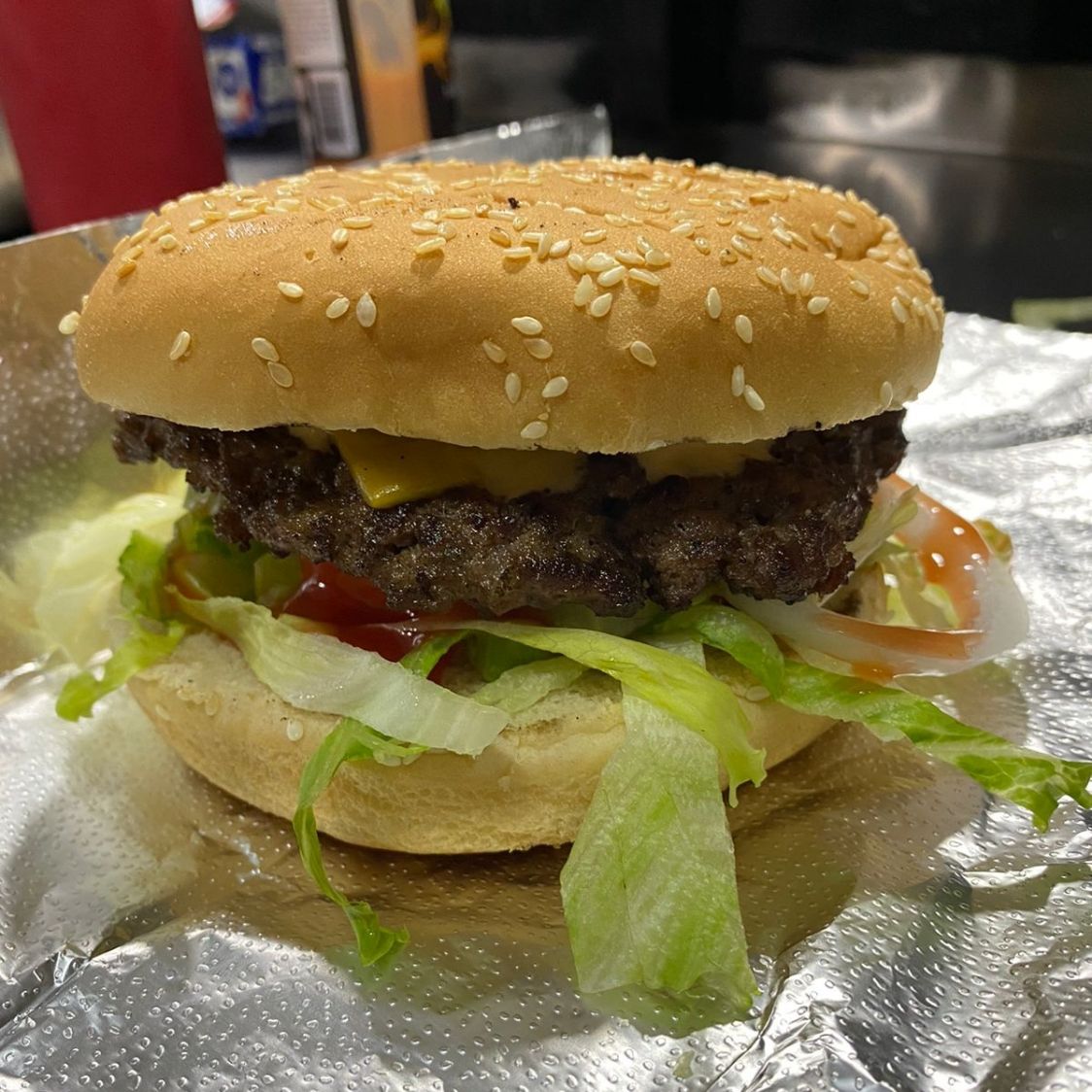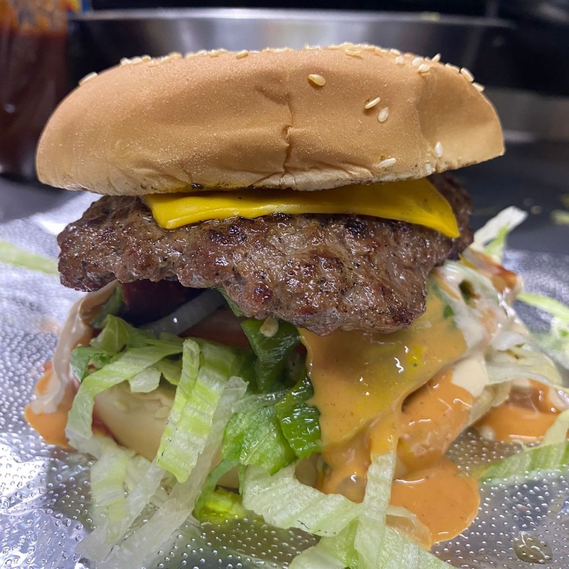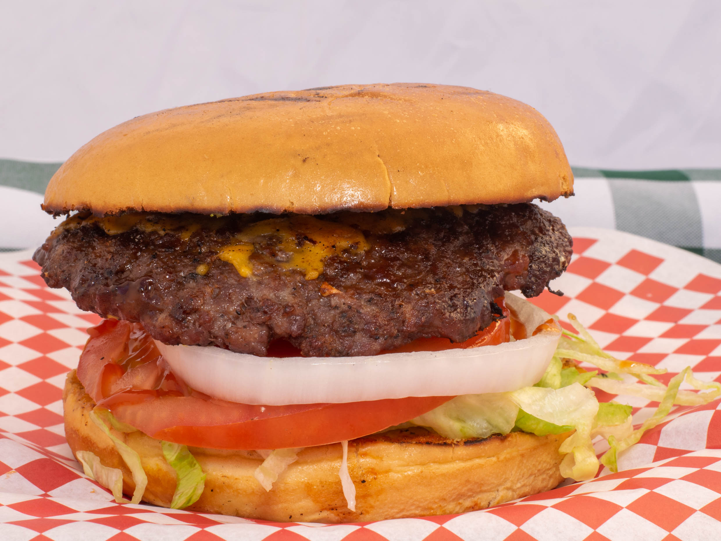 Pan parrillero, carne 100% de res con queso americano, tomate, lechuga, cebolla, catsup, mostaza y aderezo de la casa.