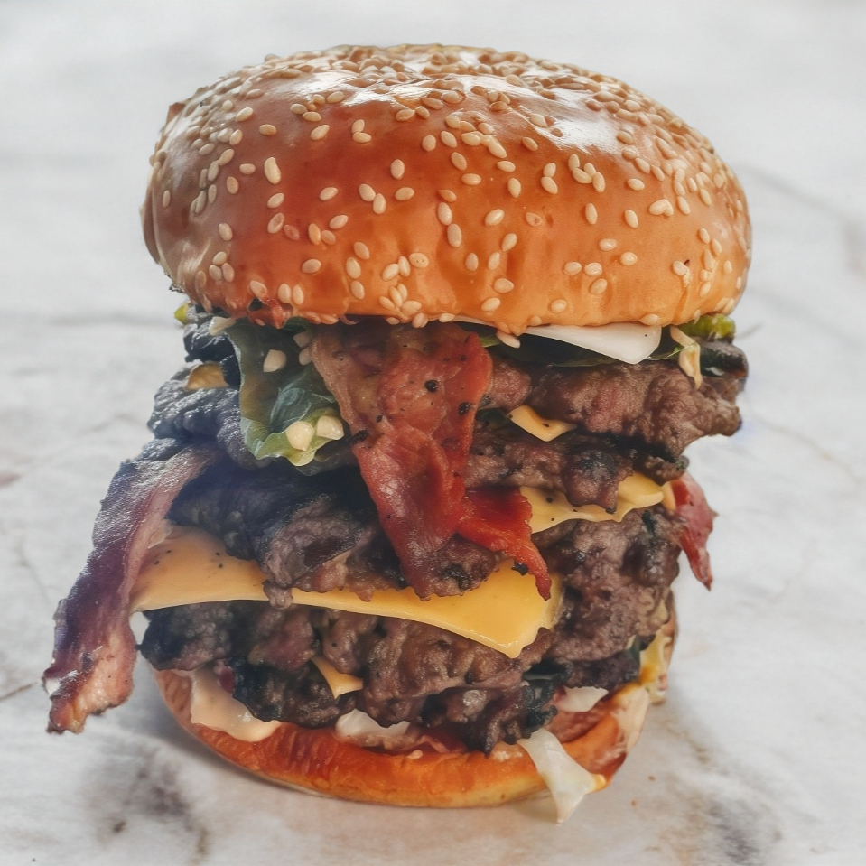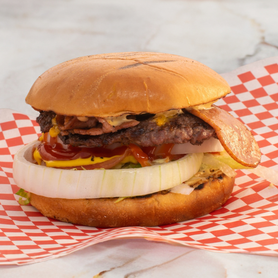 Pan parrillero, carne 100% de res con triple carne y triple queso, tomate, lechuga, cebolla, catsup, mostaza y aderezo de la casa.