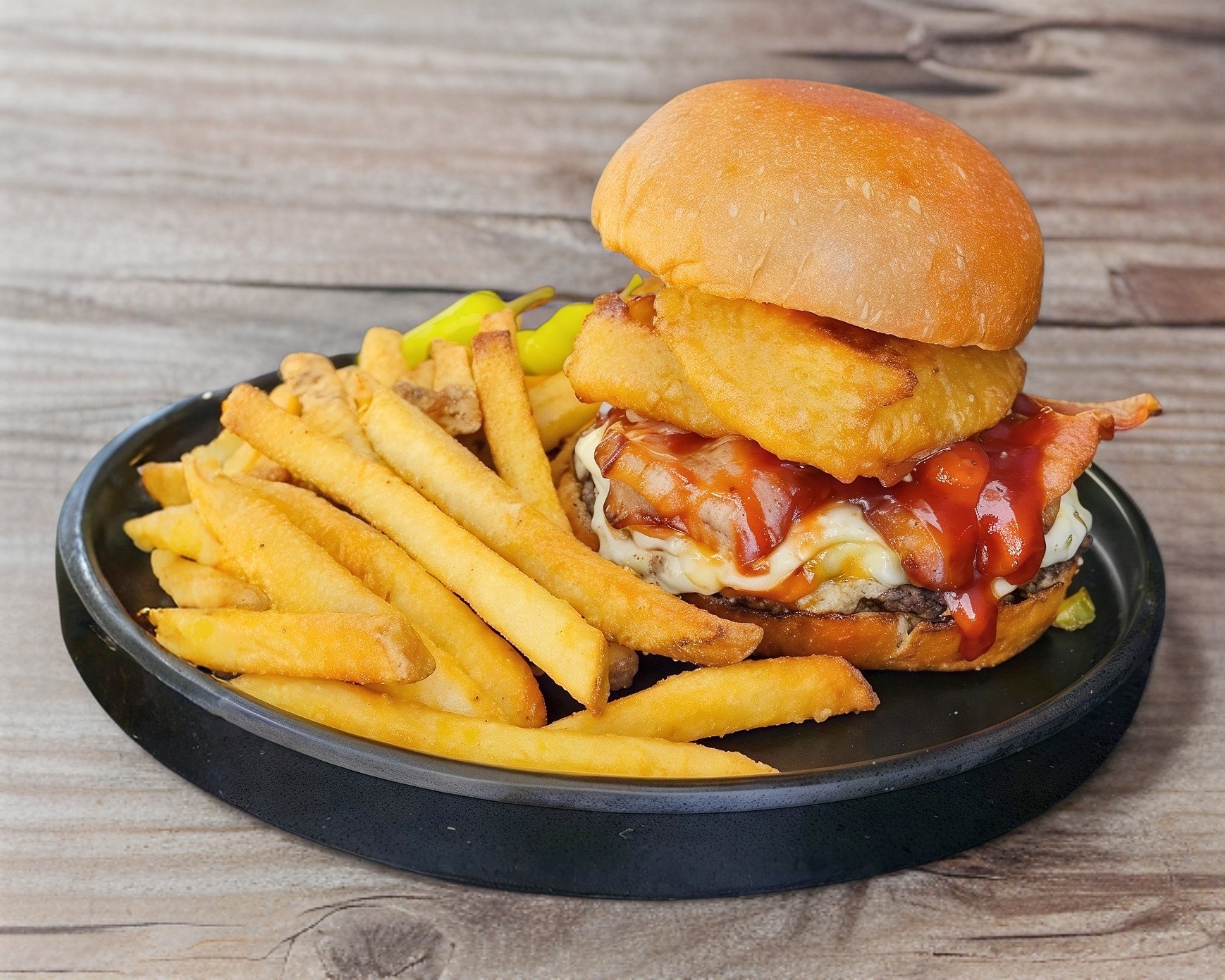 Rápida, crujiente y llena de actitud. 150g de carne de res, tocino, queso suizo, aros de cebolla y salsa BBQ. Crujido, actitud y velocidad. Todo en una sola burger. Acompañada de papas fritas.