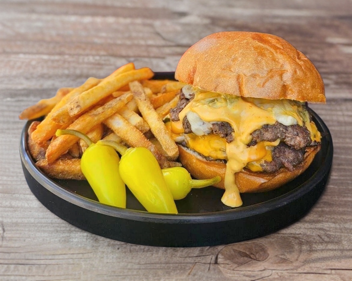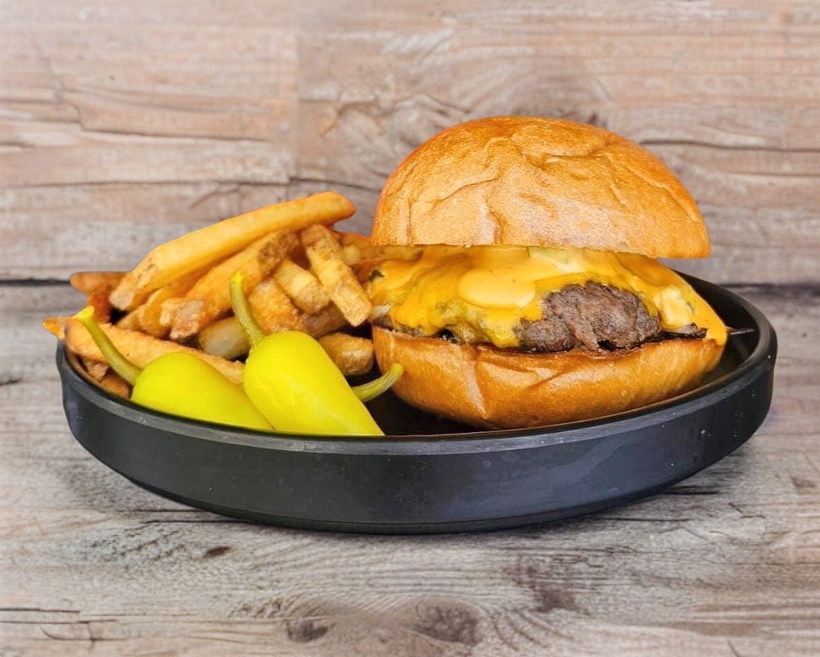 La hamburguesa que salva cualquier día. 150g de carne de res, cebolla caramelizada, queso americano y aderezo pixelado. Clásica, poderosa y siempre al rescate. Acompañada de papas fritas.