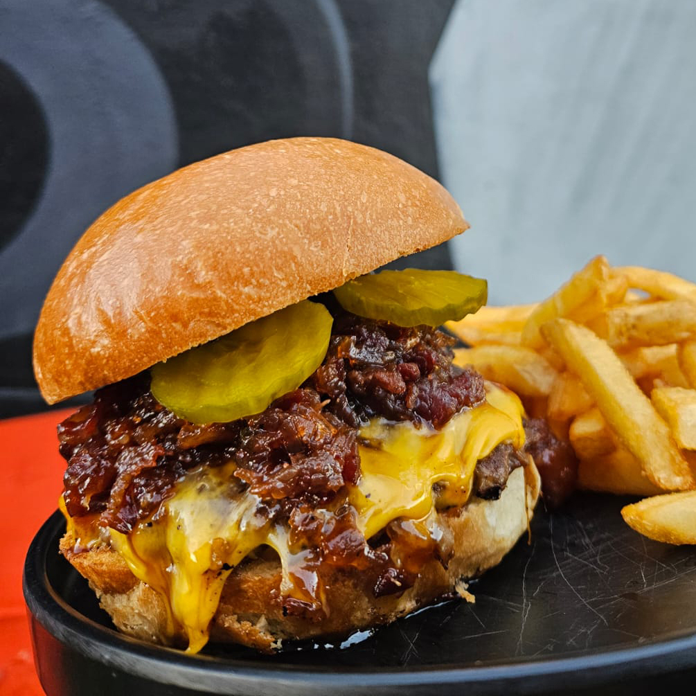 La nueva campeona del antojo: carne jugosa, queso americano derretido, mermelada de tocino con ese toque dulce-saladito, pepinillos crujientes y nuestro aderezo especial que te noquea al primer mordisco.