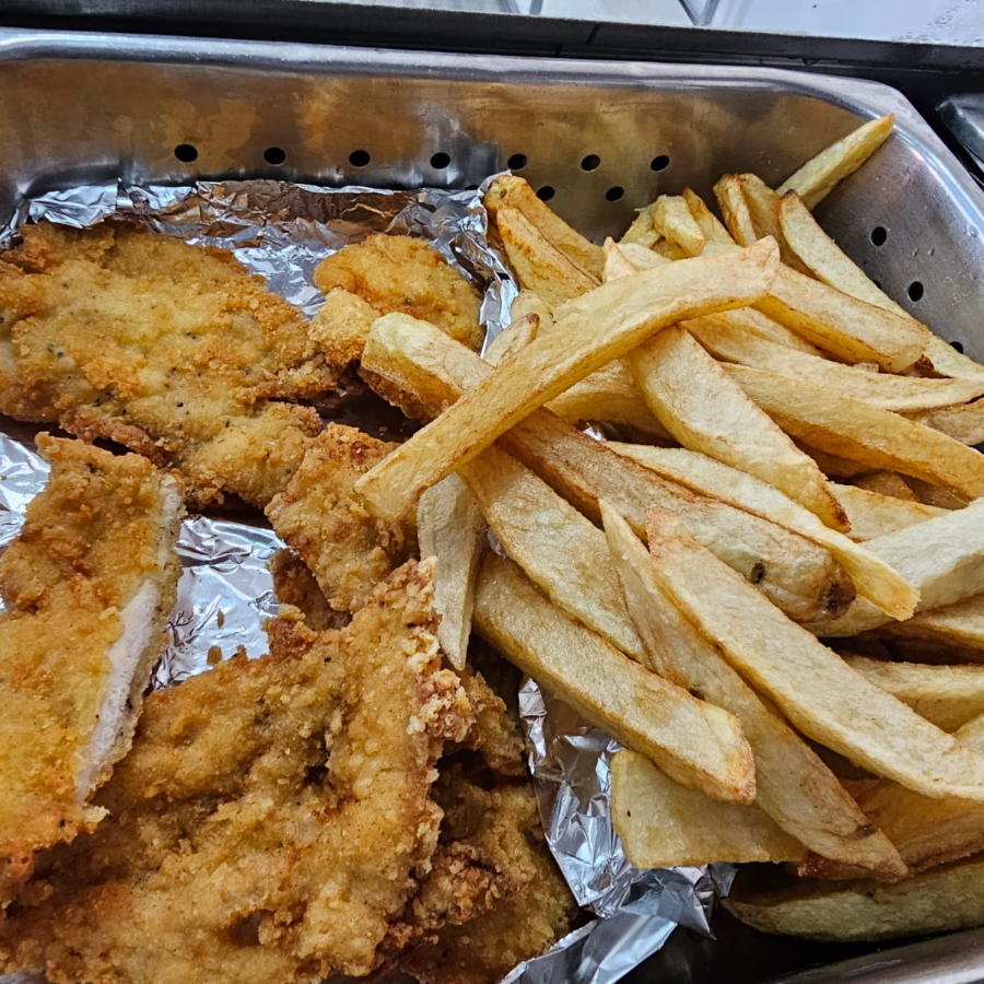 Mega burro de pechuga empanizada servido con papas fritas, arroz y frijol