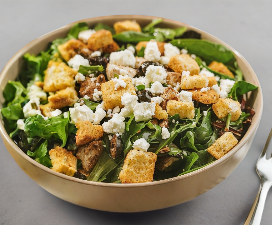Pechuga de pollo, mix de lechugas, aceituna negra, arandanos, queso feta, crotones aderezados con vinagreta balsámica