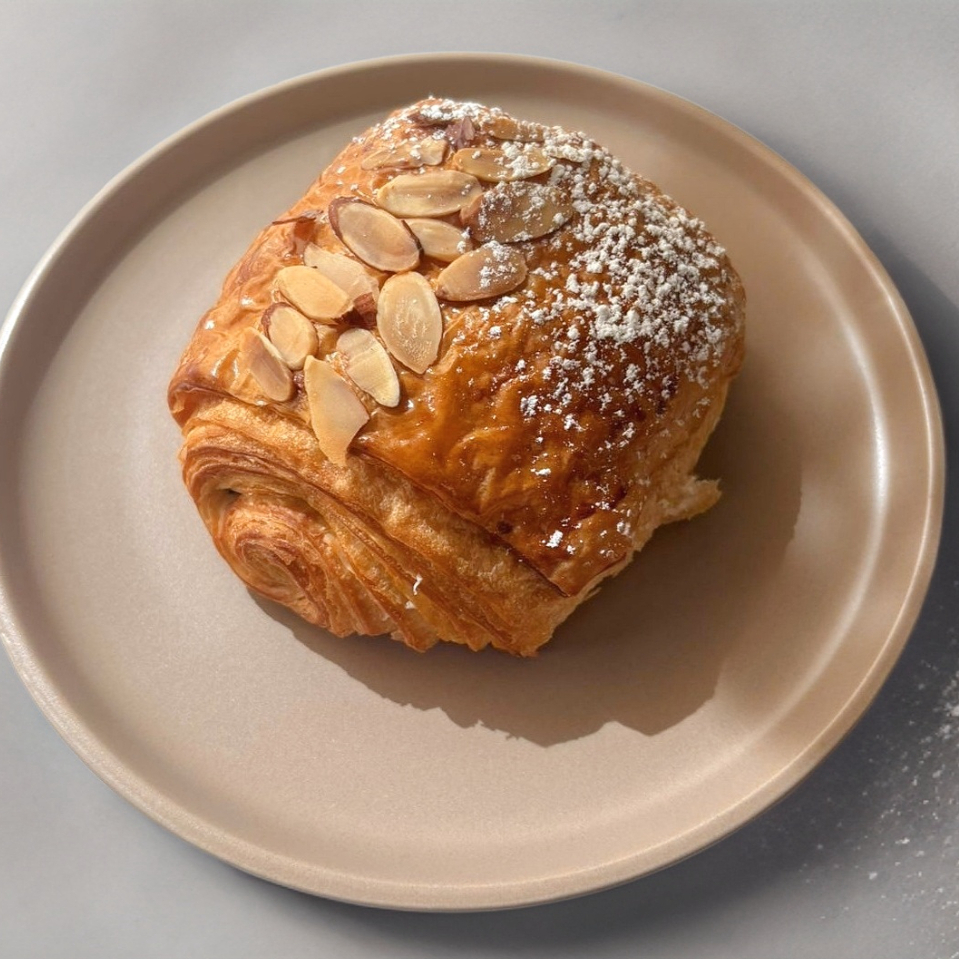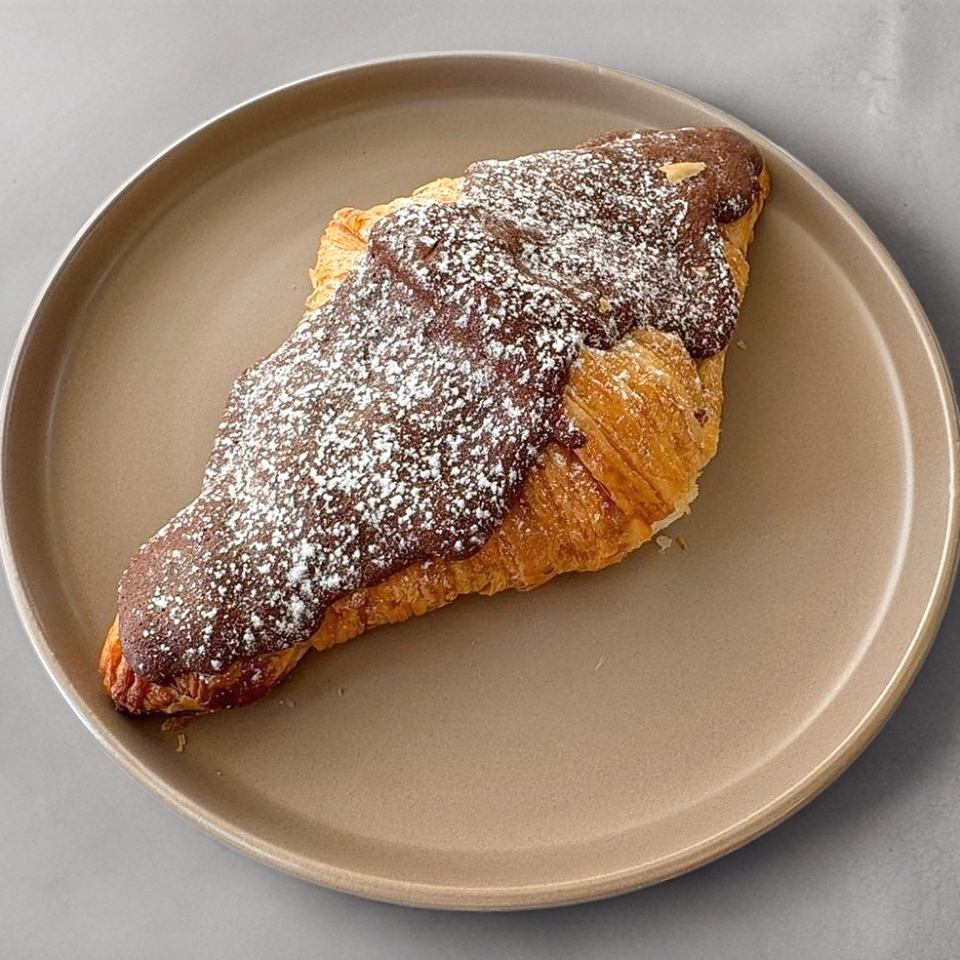 Croissant hojaldrado relleno de crema y almendra cubierto de chocolate.