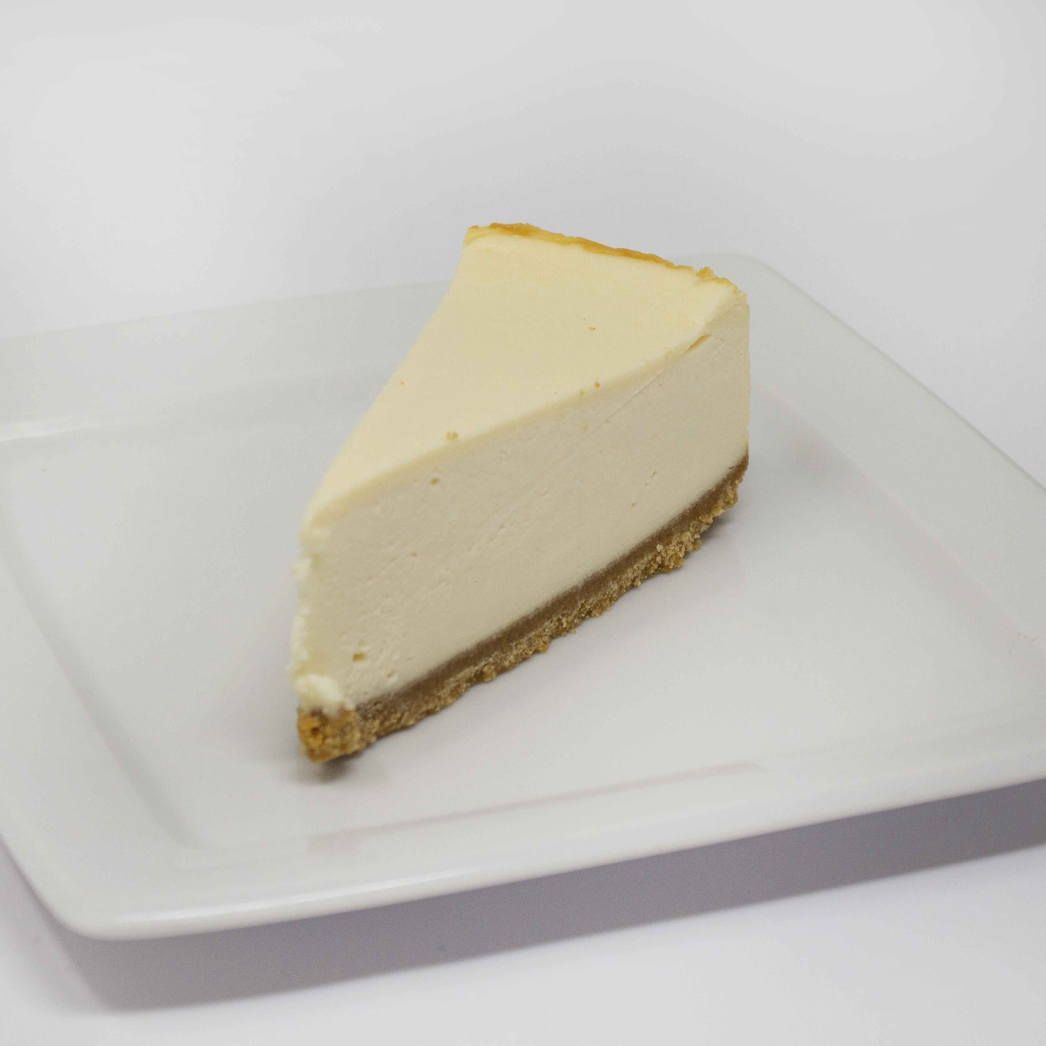 Una rebanada de nuestro pay de queso, crocante de la orilla y suave por dentro.