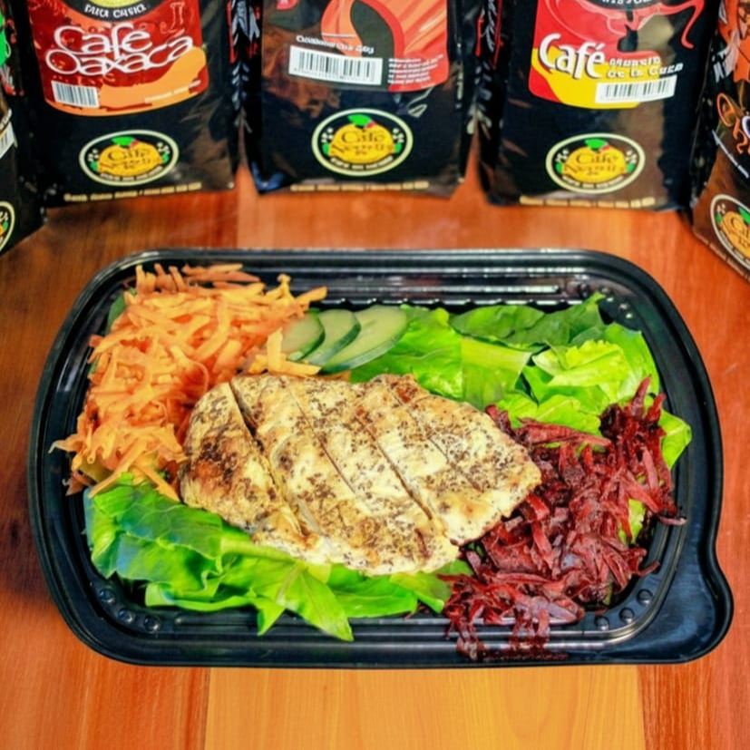 Crujientes hojas verdes con pechuga de pollo a la plancha, aderezo y crutones.