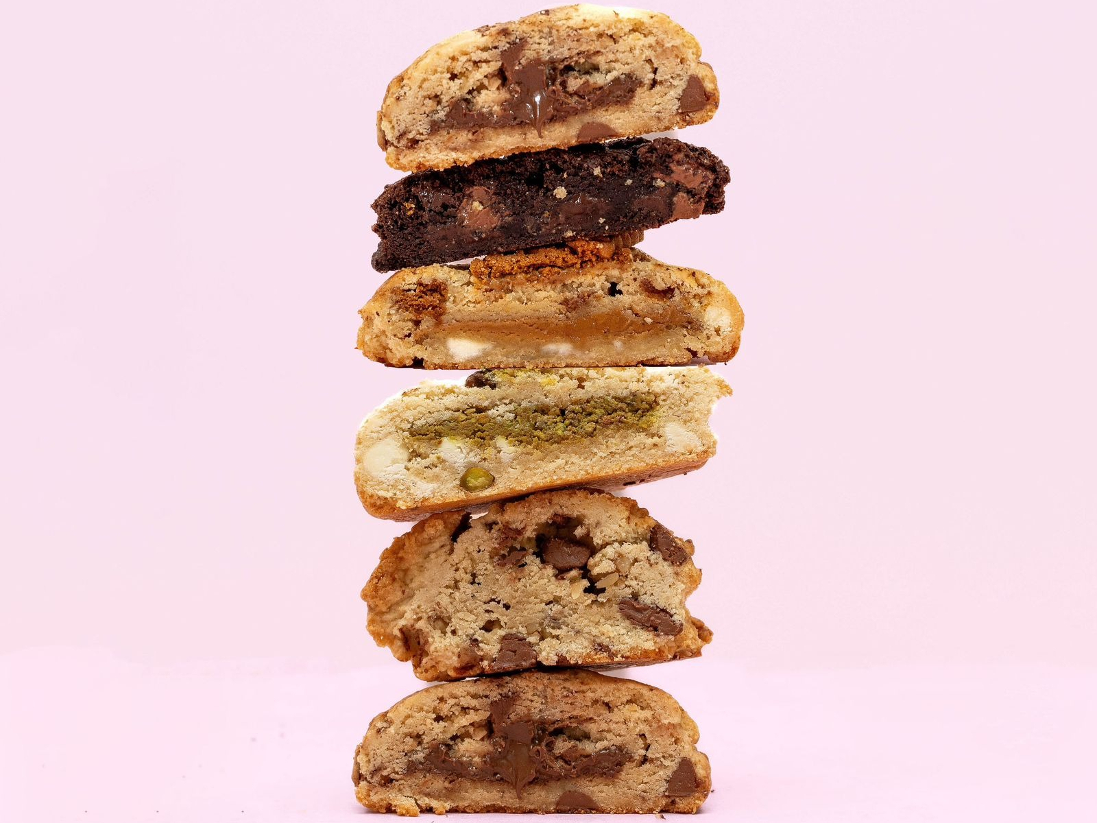 En la mezcla, contiene pistachos enteros y chispas de chocolate blanco. Rellena de praliné de pistacho.