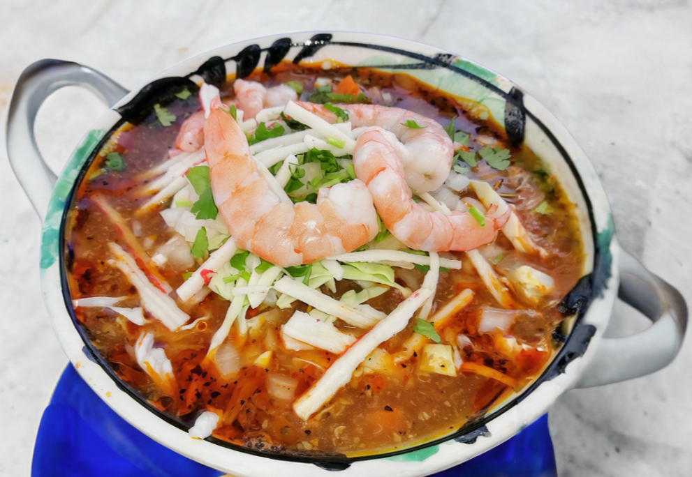 Es el jugo de la cahuamanta, pero en ves de ser mantarraya es puro camarón. Acompañado de sus verduras, tortillas, salsita y cebollas curtidas.