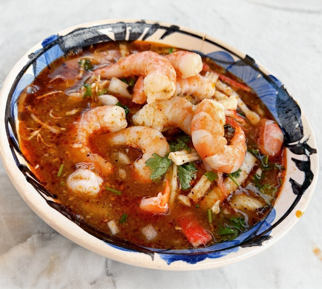 Comida tipica del estado de Sonora con el mejor sazón de allá, contiene camarón. Acompañado de sus verduras, tortillas, salsita y cebollas curtidas.