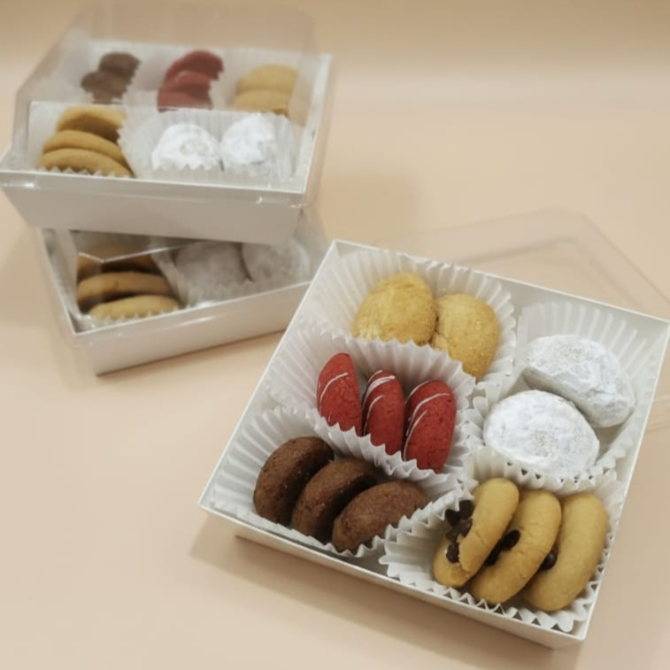 CAJA DE GALLETAS MIXTAS. sabor: nuez, mantequilla, chocolate, chispas de chocolate y red velvet. caja de 180g en galletas.