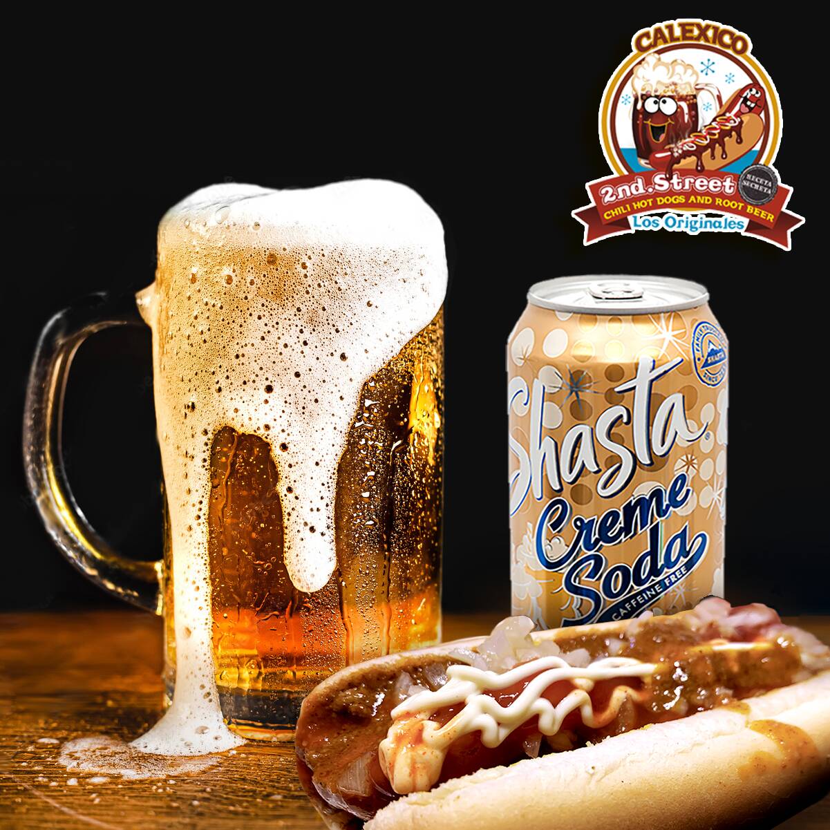 Deliciosa Helada y Burbujeante Cremosa Soda con el sabor unico para disfrutar tus Legendarios Calexico Chili Hot Dogs (Lata)