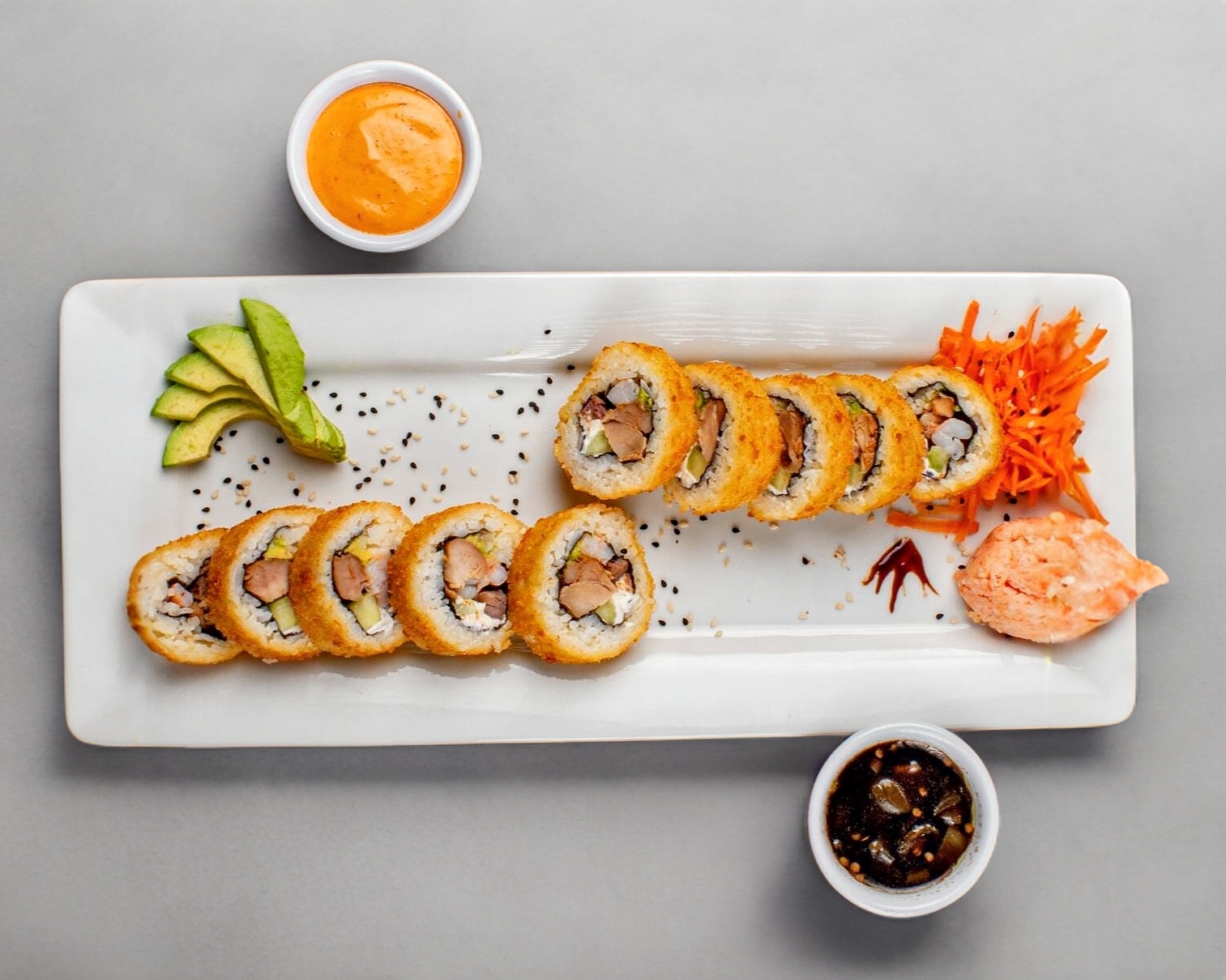 10-12 bocados; por dentro: carne, pechuga de pollo, camarón, aguacate, queso crema, pepino y alga. Por fuera: empanizado. Incluye chipotle.