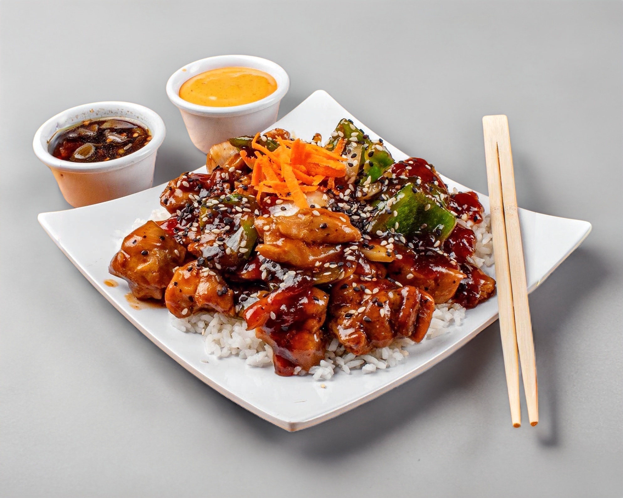 Cama de arroz blanco con la proteína de tu elección, verduras salteadas (chile morrón y cebolla), bañado en nuestra deliciosa salsa teriyaki con un toque de ajonjolí. Incluye chipotle.
