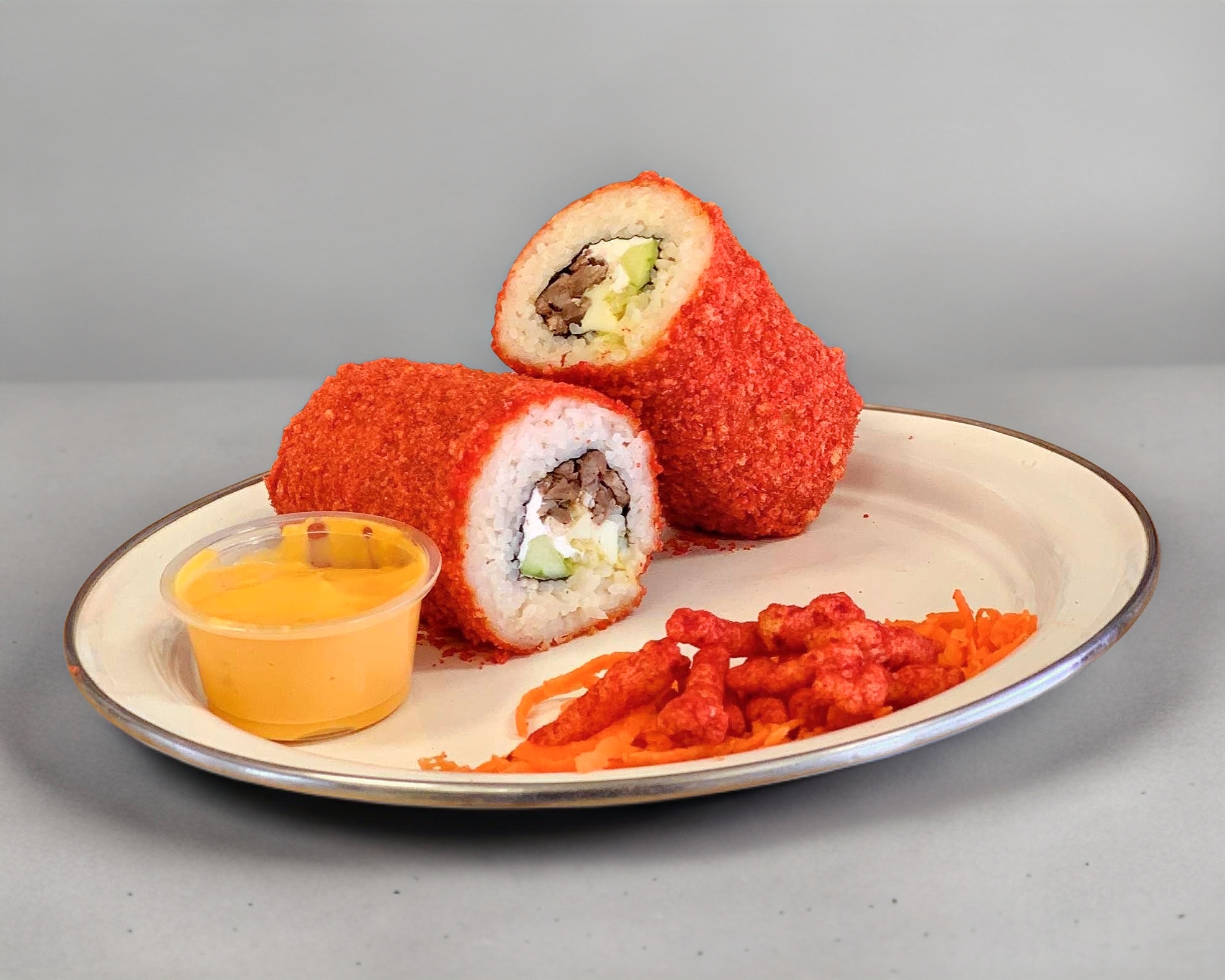 Por dentro: Pechuga de pollo, carne, camarón, queso crema, aguacate, pepino y alga. Por fuera: Forrado de cheetos flamin hot. !!!!CORTADO A LA MITAD!!! y acompado de queso para nachos.