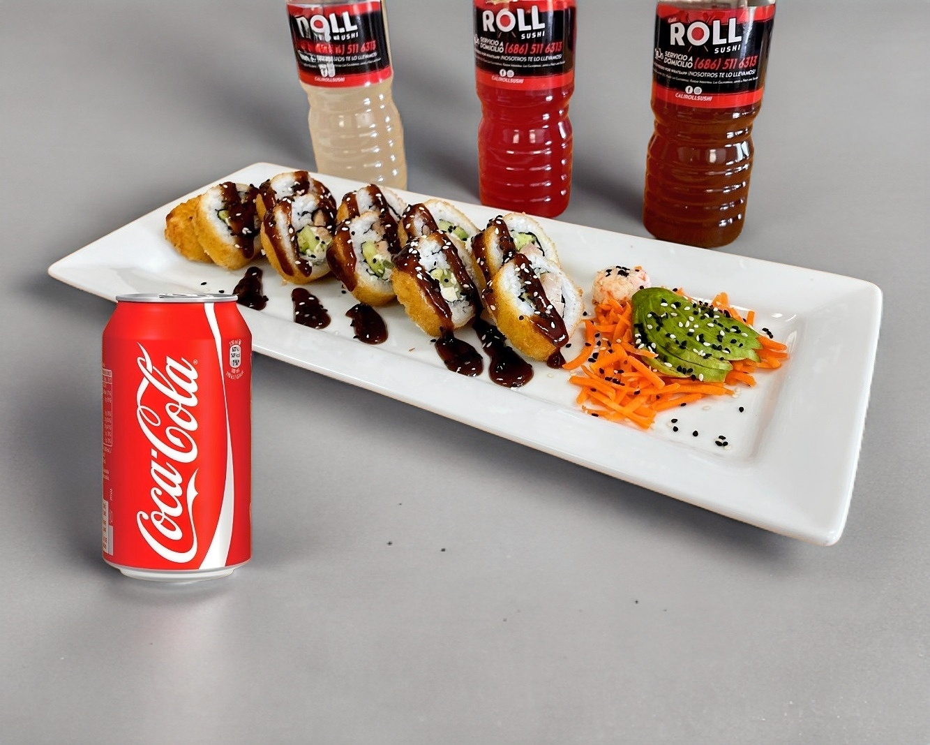 1/2 Rollo de tu elección (5 a 6 bocados)+ Teriyaki + Bebida de 500ml. Incluye chipotle.