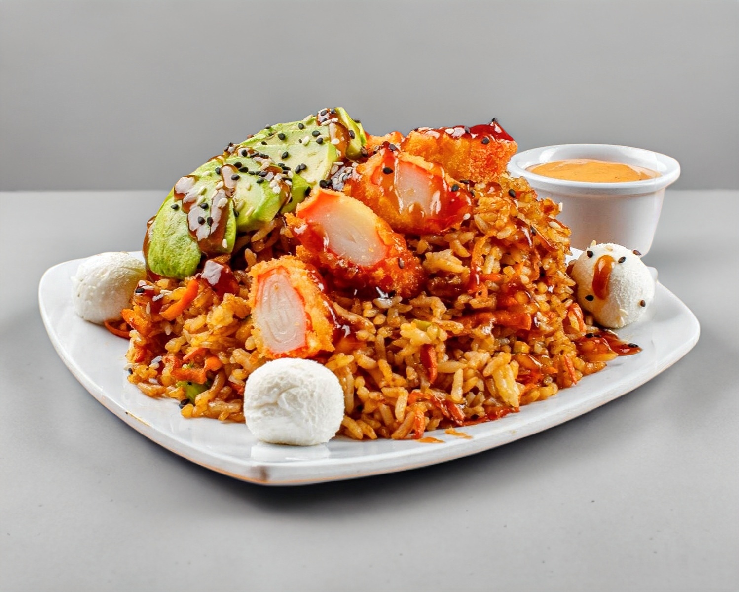 Arroz frito con verduras, zanahoria, calabaza y cebollin, con queso philadelphia, aguacate y tampipco empanizado. Incluye 1 chipotle.