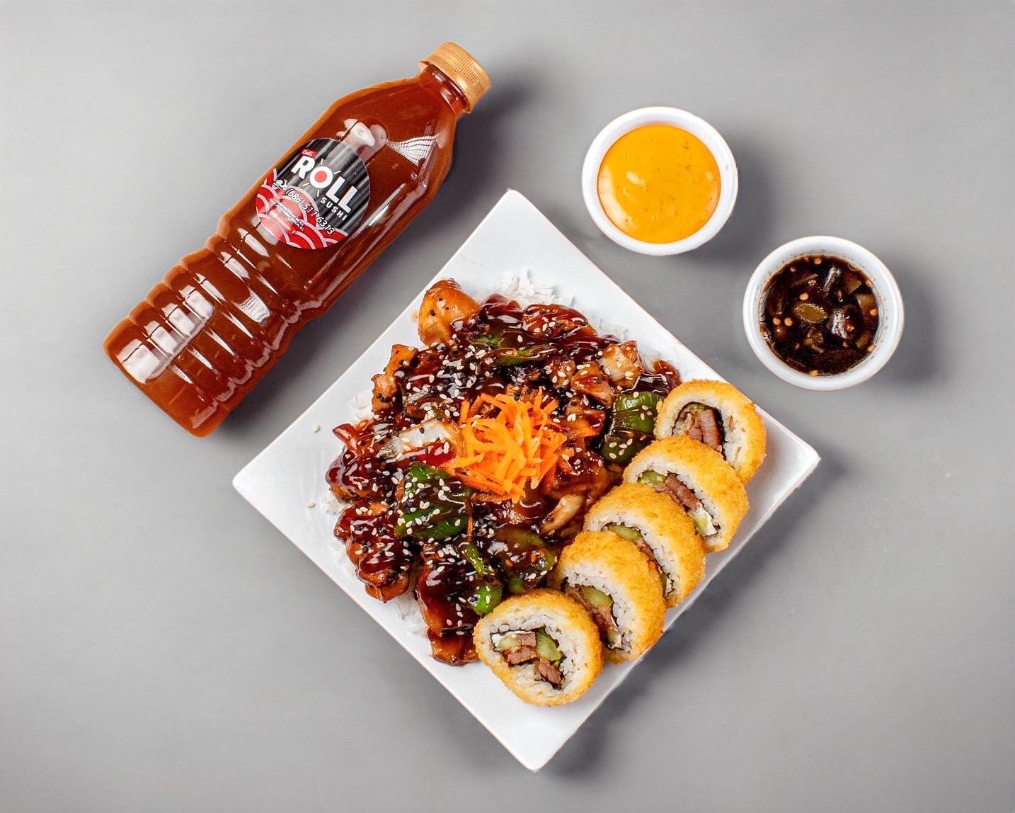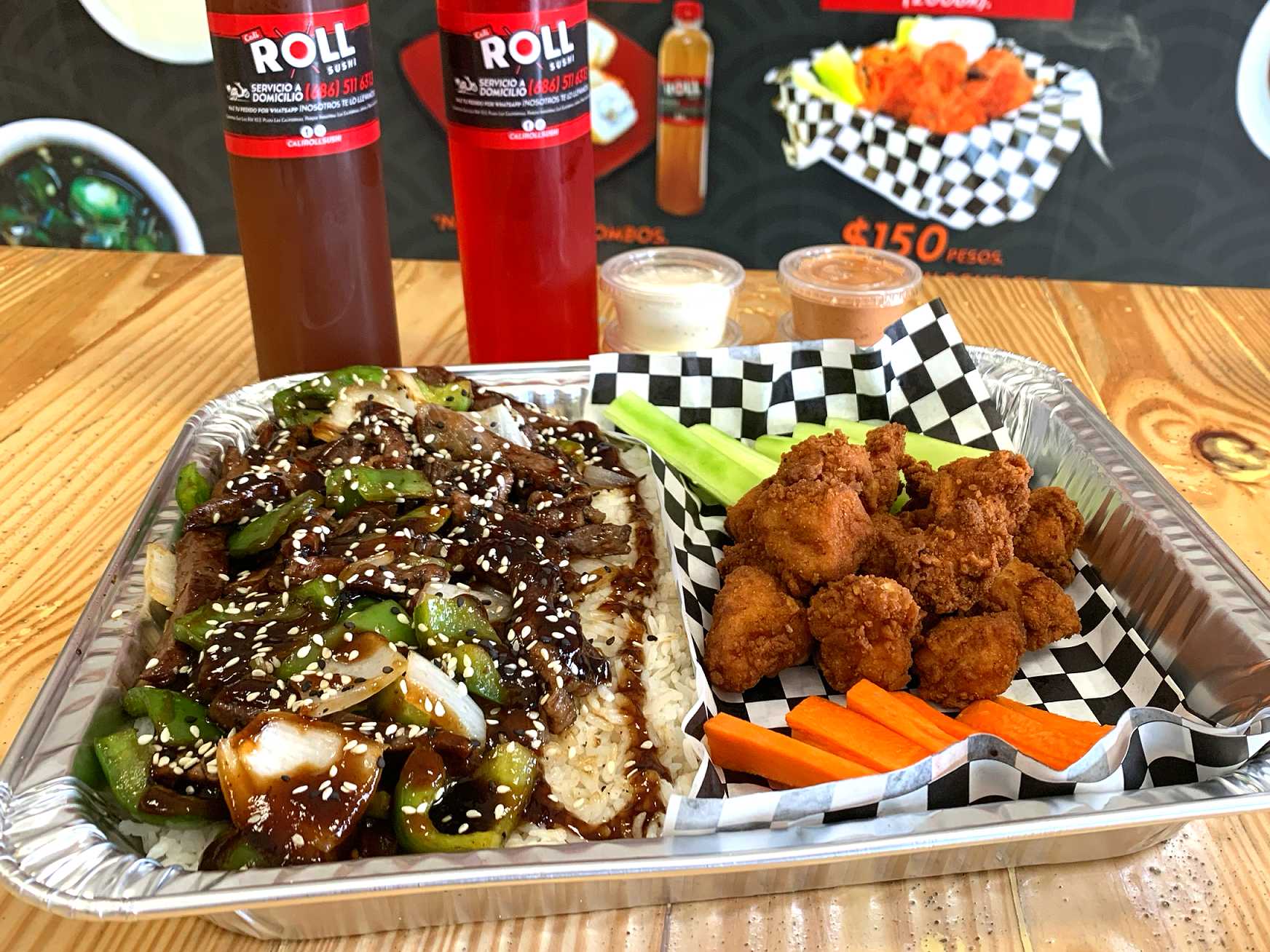 2 rollos a elegir (Cada rollo con 10 bocados aprox) + teriyaki de pollo. Incluye 3 salsas chipotle, maximo para 4 personas