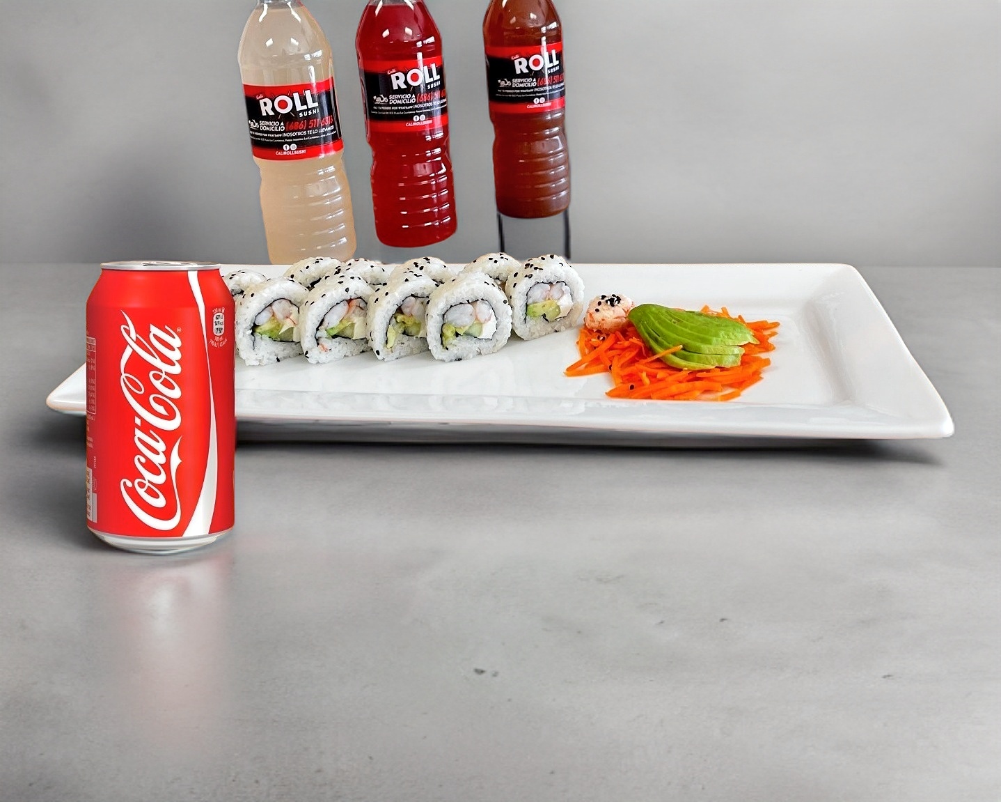 Por dentro: zanahoria, pepino, aguacate y queso crema. Por fuera: Alga. Incluye chipotle.
