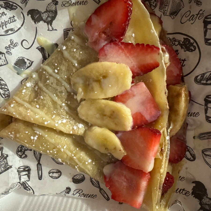 Crepa de queso crema, zarzamora, platano y fresa.