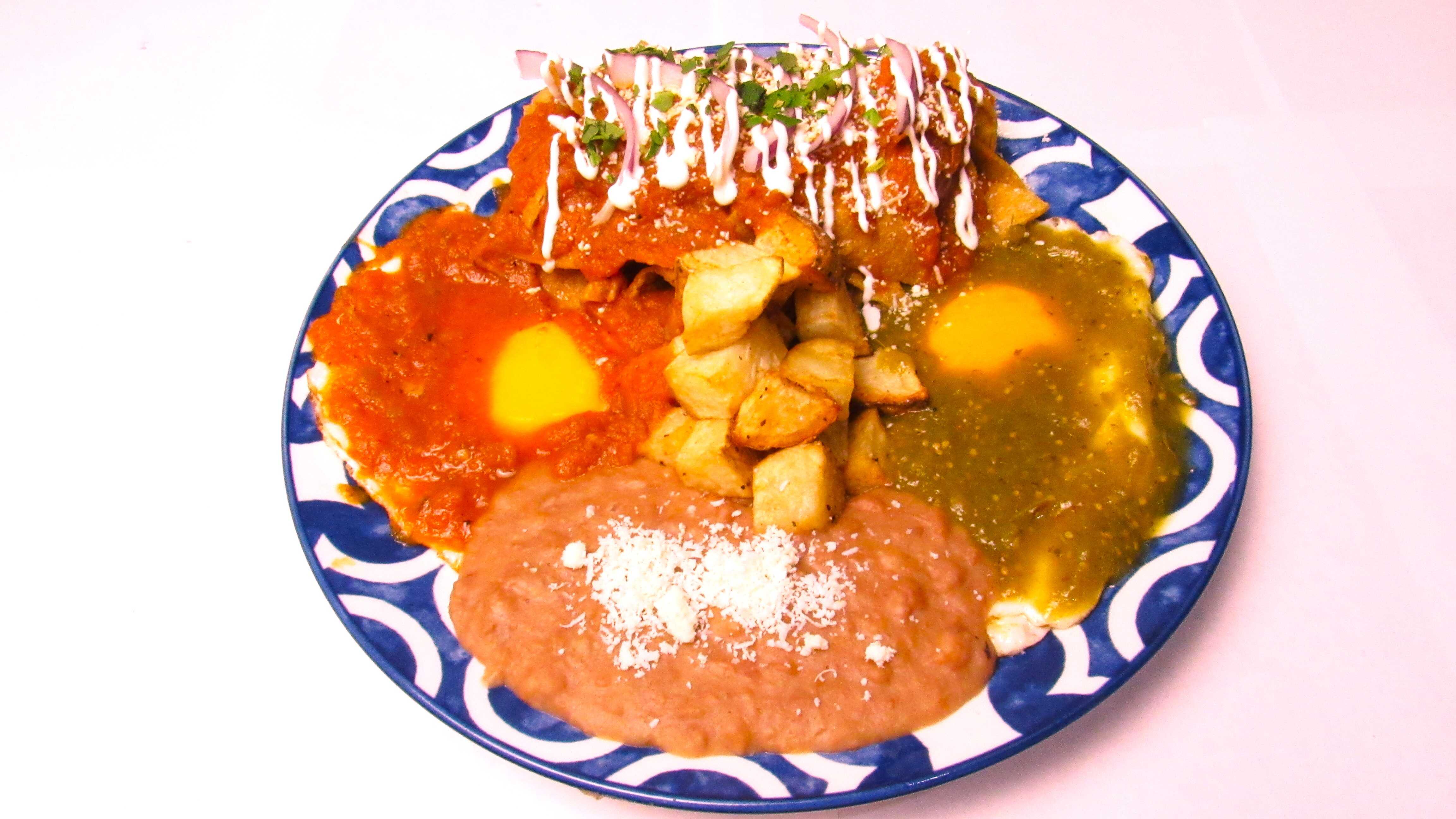 Con frijol, papas y chilaquiles.
