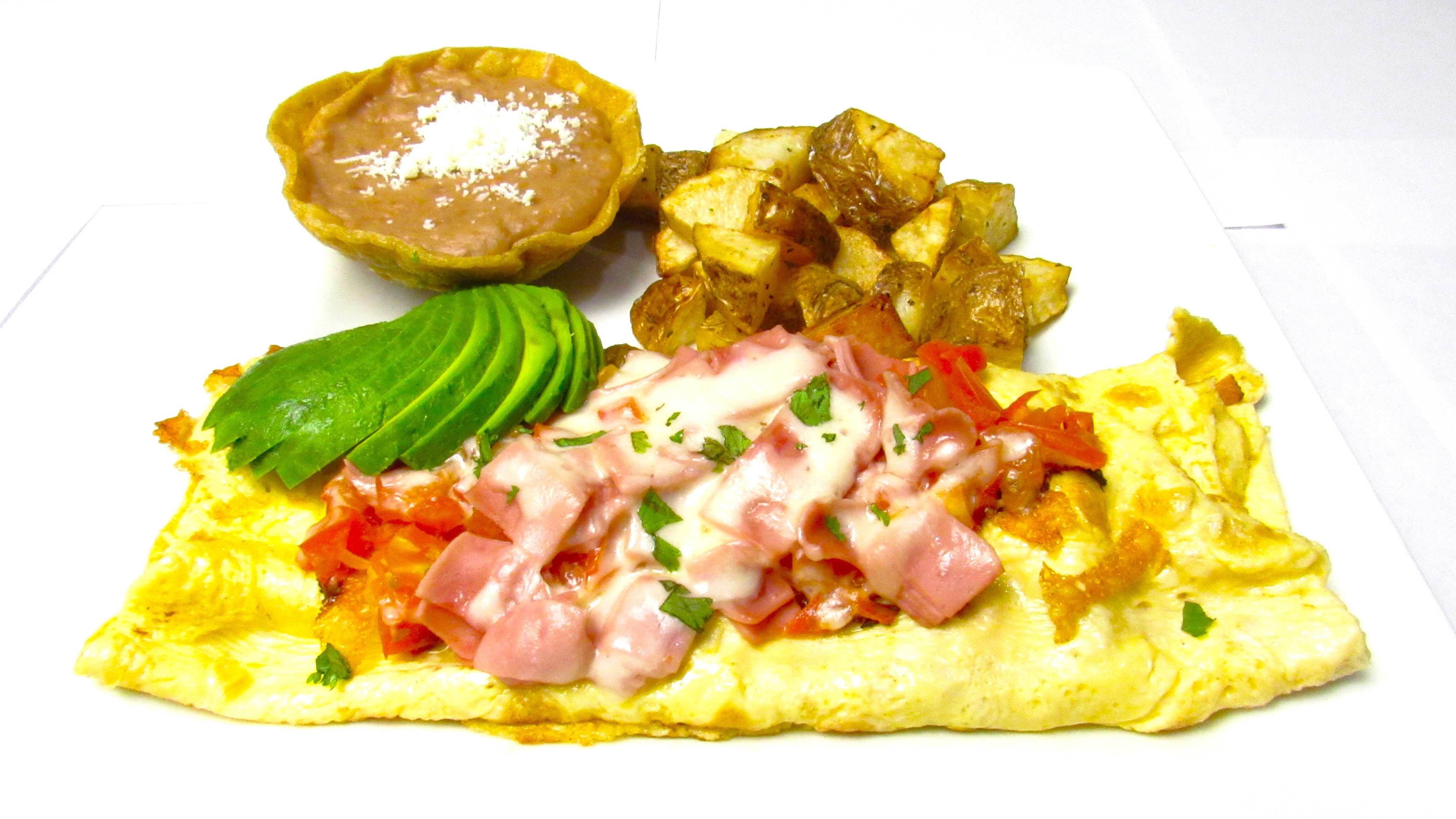 Jamón, tocino, cebolla y aguacate. Acompañado con papas y frijoles.