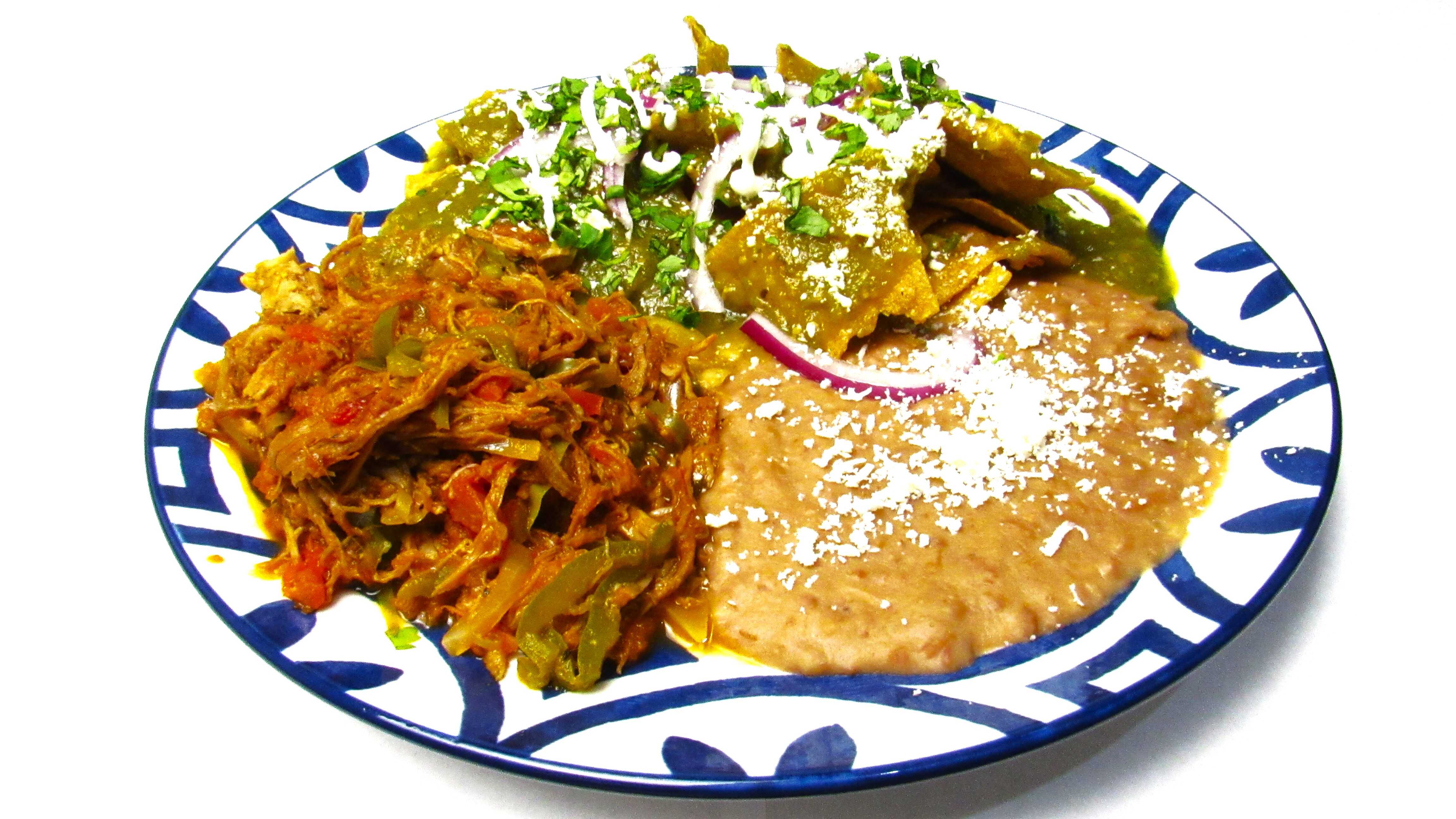 Machaca con chilaquiles y frijoles.
