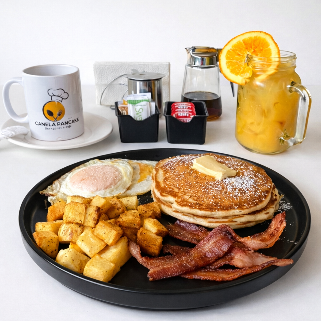 Pancakes esponjosos estilo americano, acompañados de dos huevos, tocino crujiente y papas campesinas o hash brown.