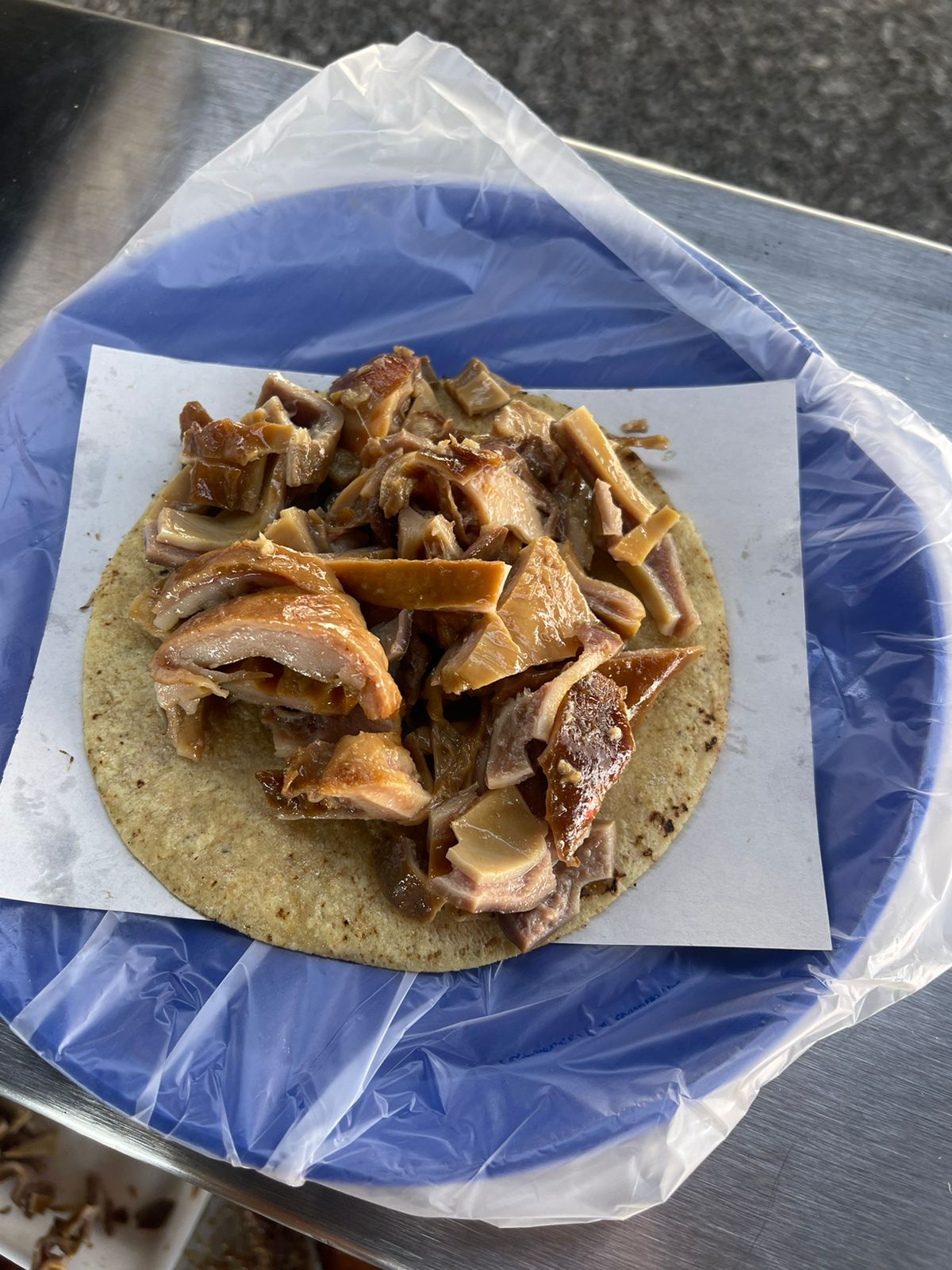 Taco de cuero de cerdo, suave y lleno de sabor, servido en tortilla de maíz con repollo, cebolla, salsas y limón.