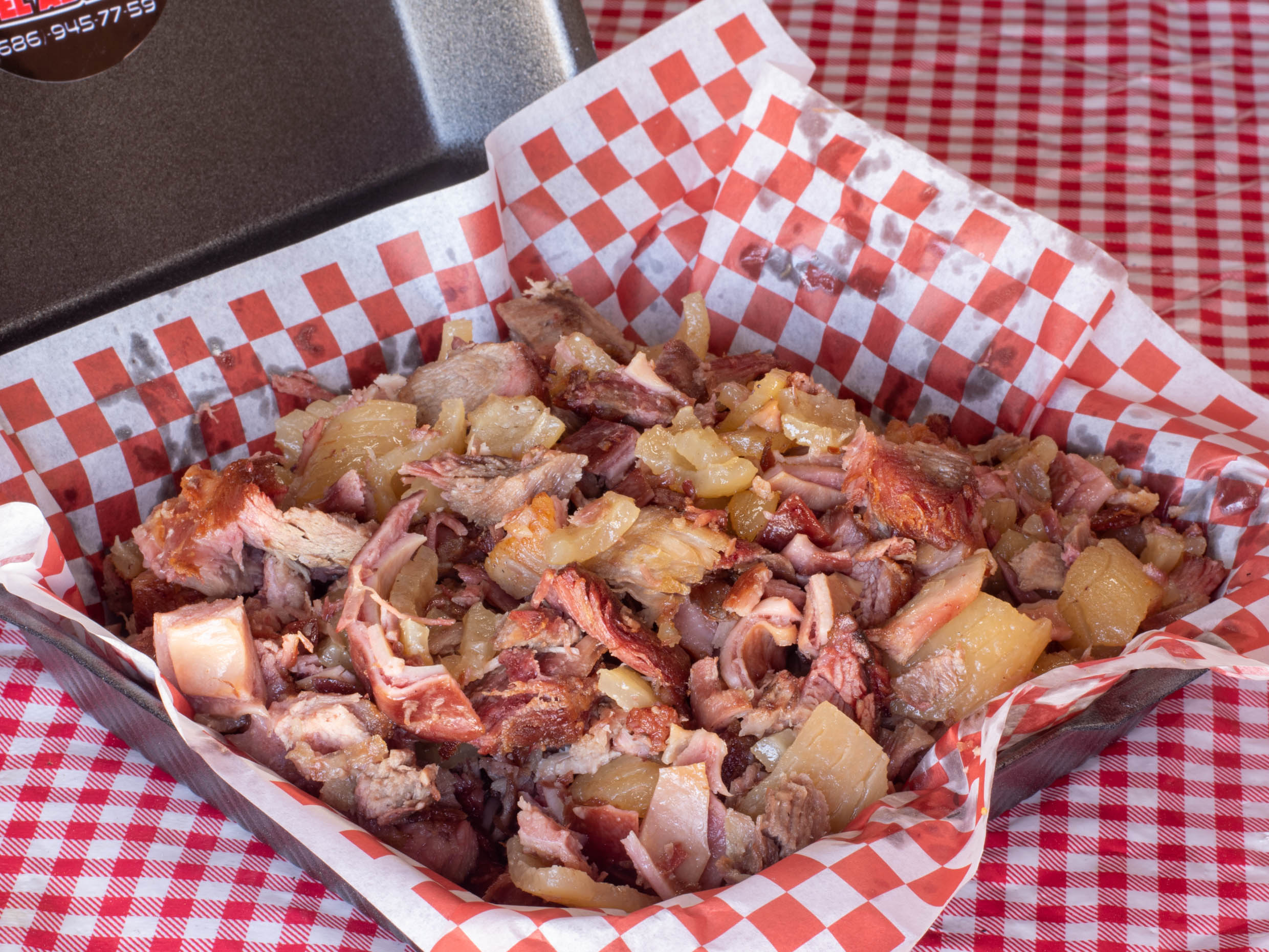 1/4 kg Chicharrón de Papada/cachete de cerdo acompañado de salsa y limones.