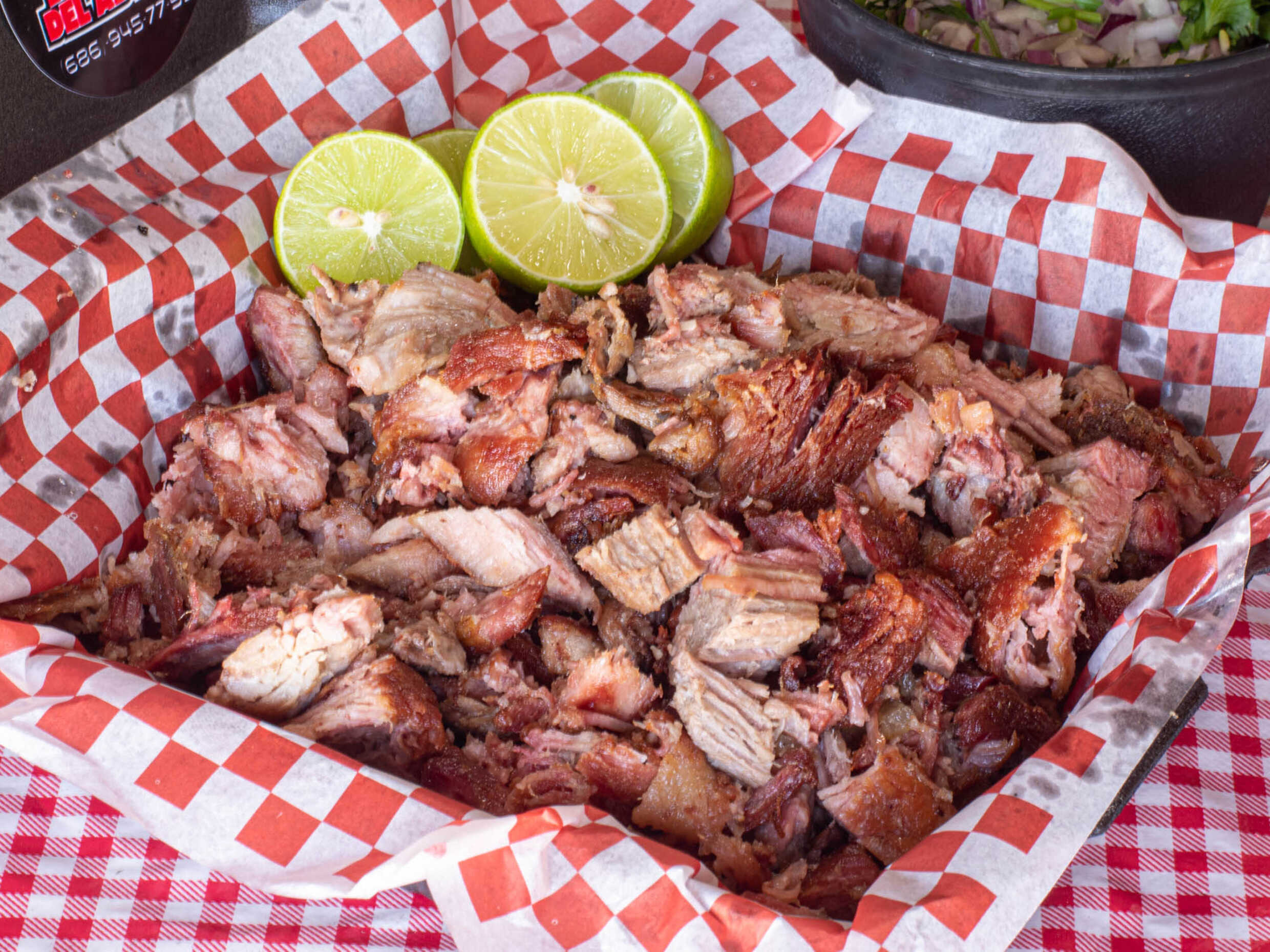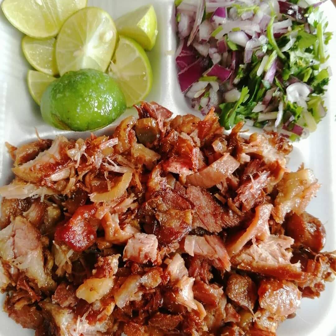 1/2 Kilo de Carnitas Maciza, incluye: tortillas, salsa roja, limones, cebolla y cilantro.