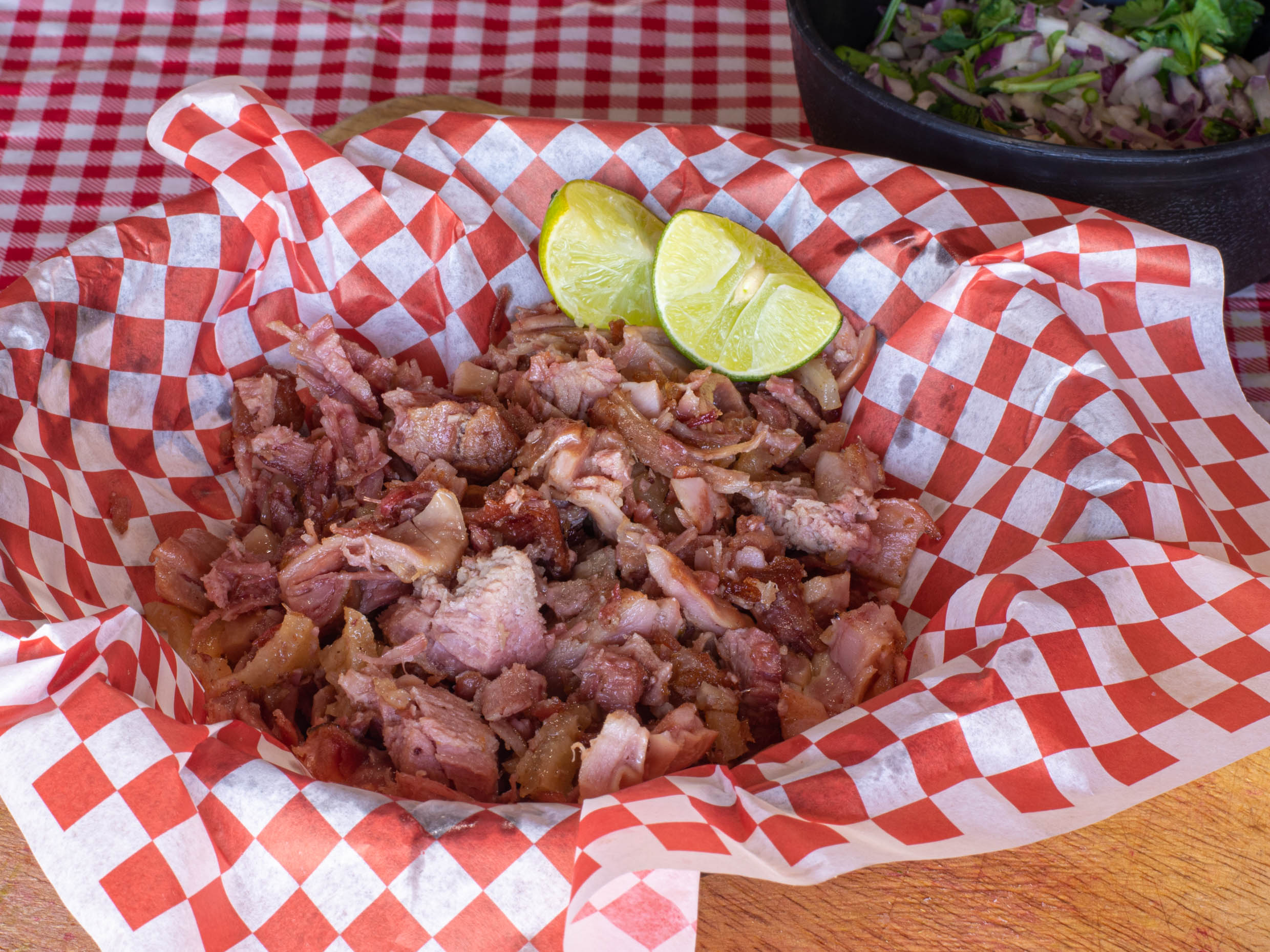Orden Personal de Carnitas, incluye: 300g de maciza, tortillas, salsa roja, limones, cebolla y cilantro.