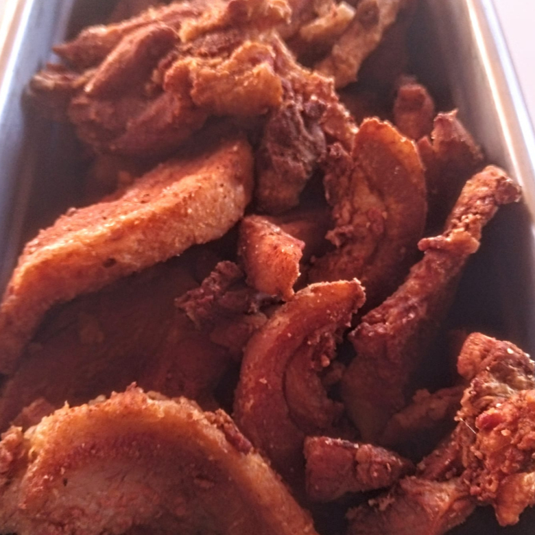 1/2 kg Chicharrón de Papada/cachete de cerdo acompañado de salsa y limones.