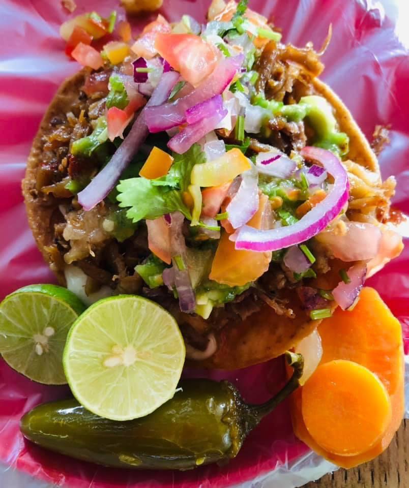 Tostada de maíz. Incluye verdura y carnitas a elegir.