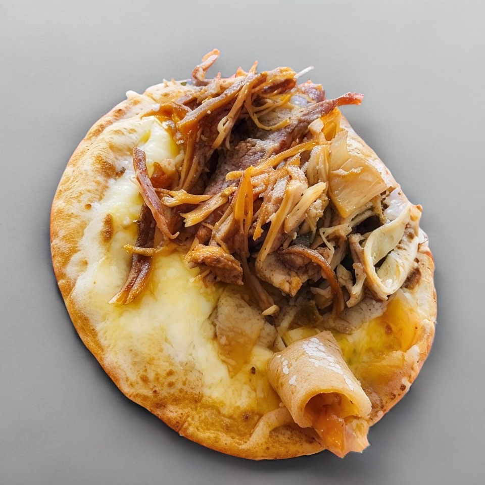 Tostada de maíz con queso. Incluye verdura y carnitas a elegir.