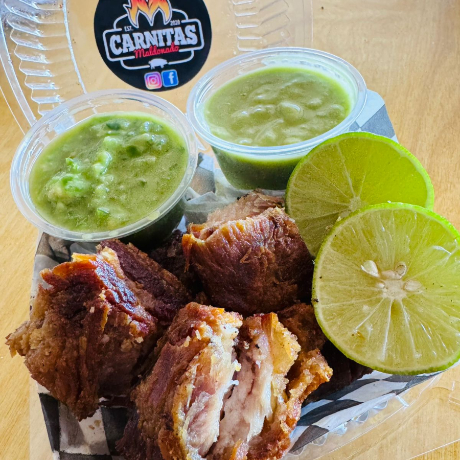 Incluye: salsa de aguacate, salsa roja, salsa bandera, limones, cebollas curtidas, rábanos y tortillas.