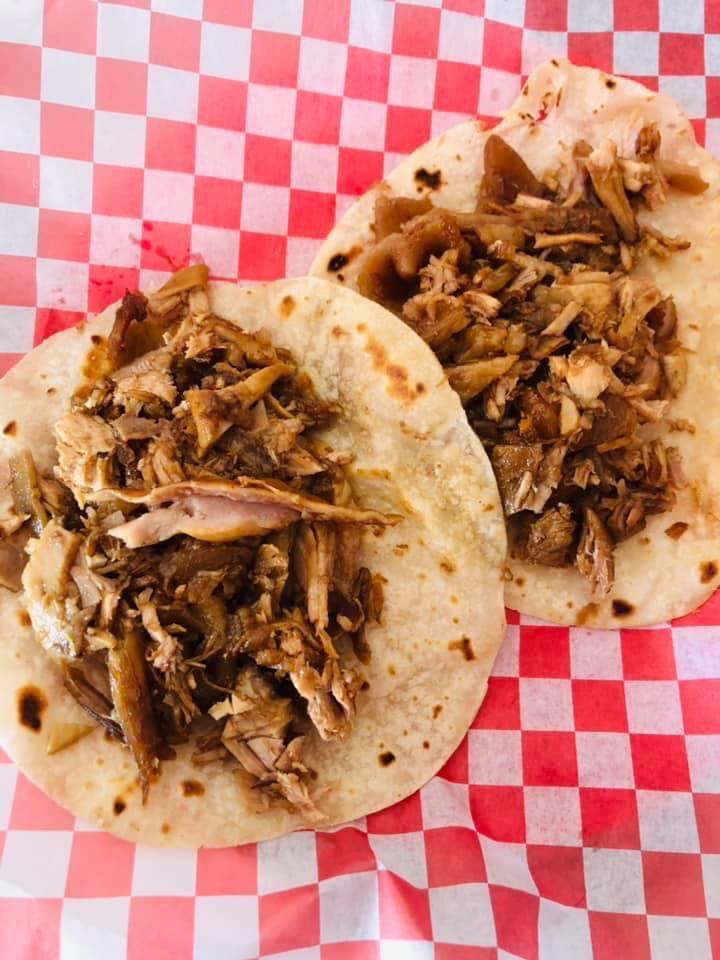 Taco de carnitas de puerco, tortilla de maíz o harina. Incluye verdura.