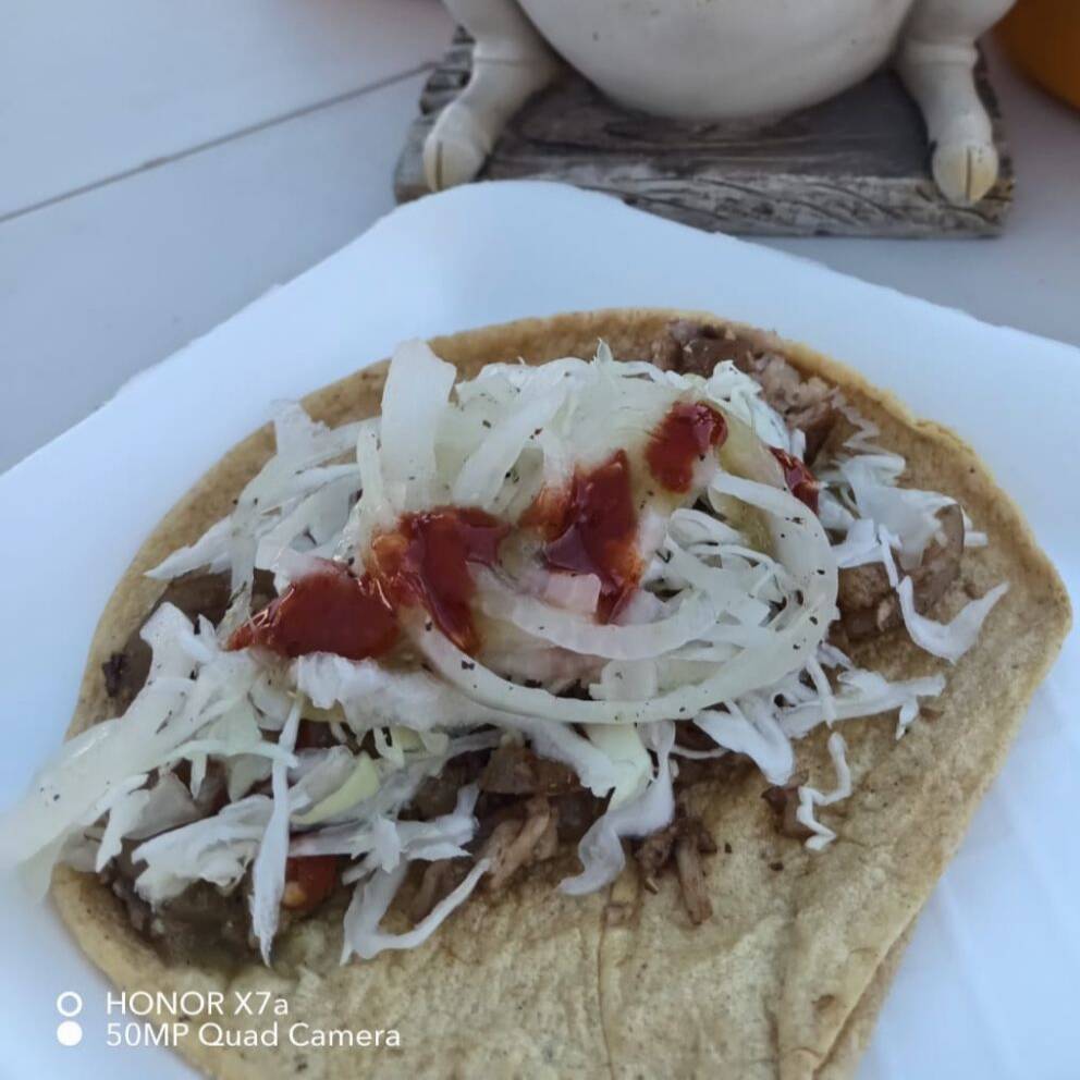 Taco de tortilla de maíz con carne maciza de cerdo.