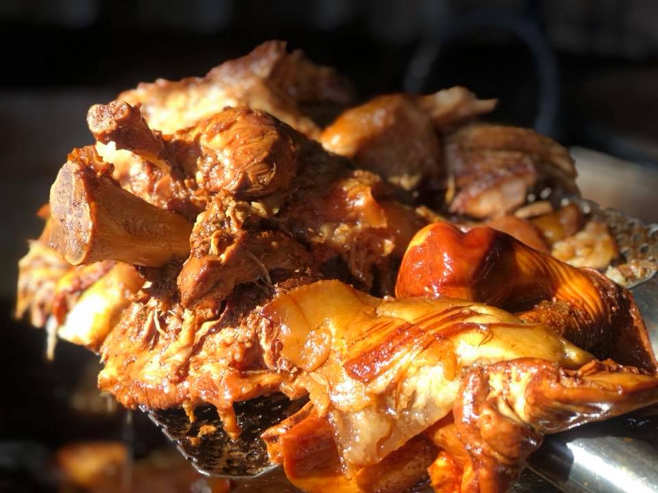 Frijoles cocinados con chorizo, chicharrón de lonja y prensado.