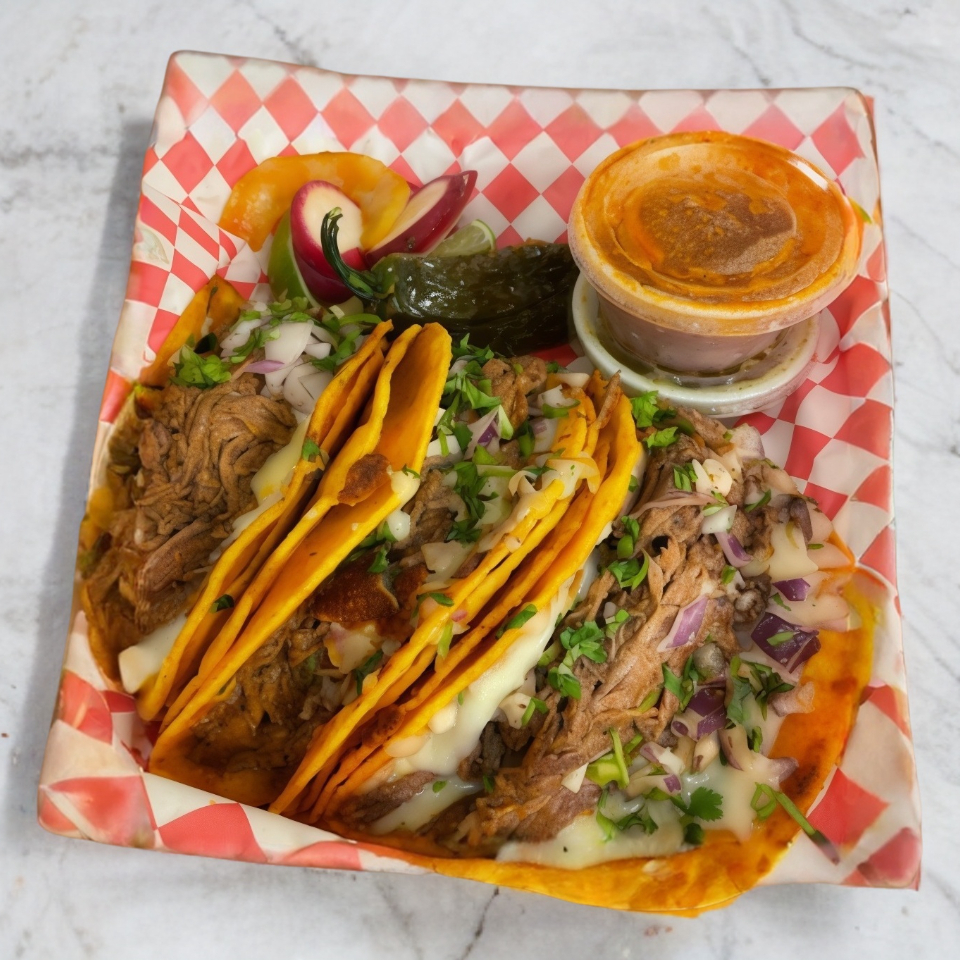 1 quesabirria de harina, 2 tacos de maiz