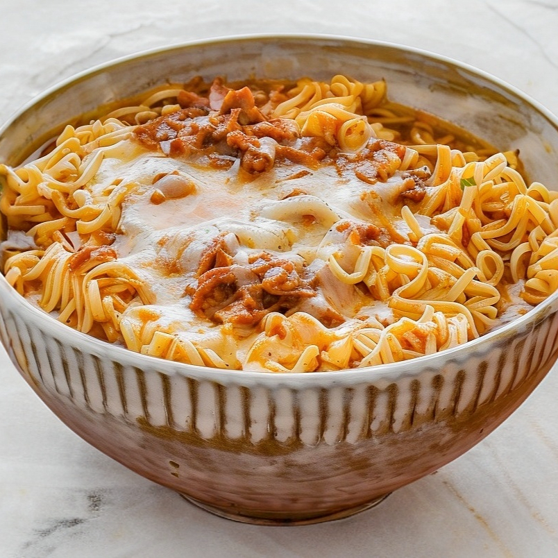 Birria con ramen y queso Monterrey, acompañado de nuestras salsas de la casa.