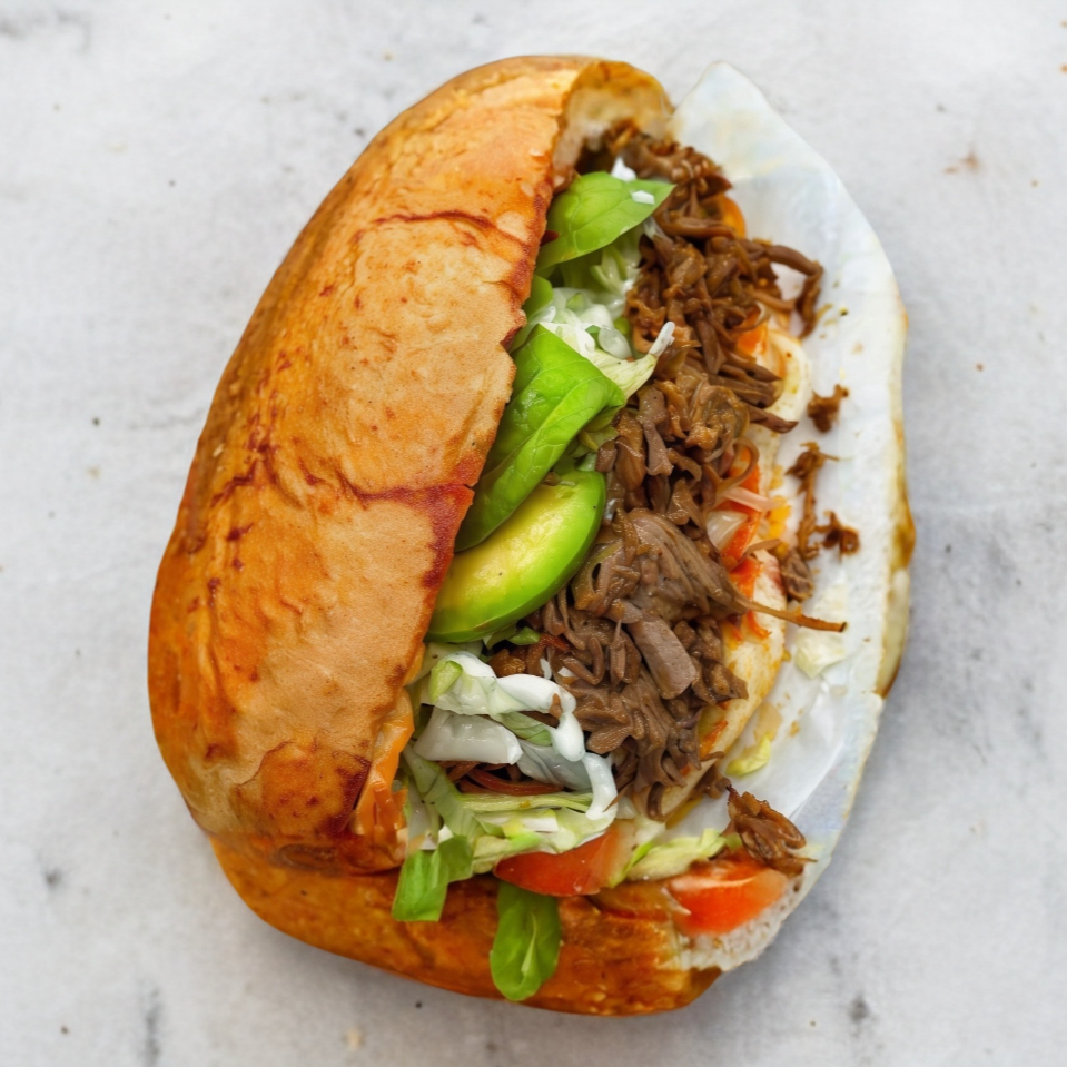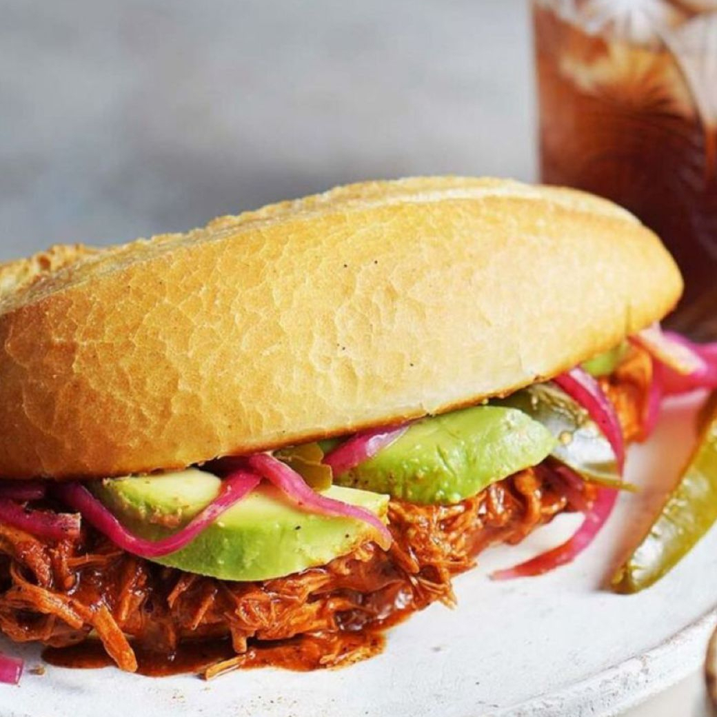 torta con cochinita pibil, lleva lechuga, cabolla encurtida, aguacate y nuestras salsas especiales de la casa.