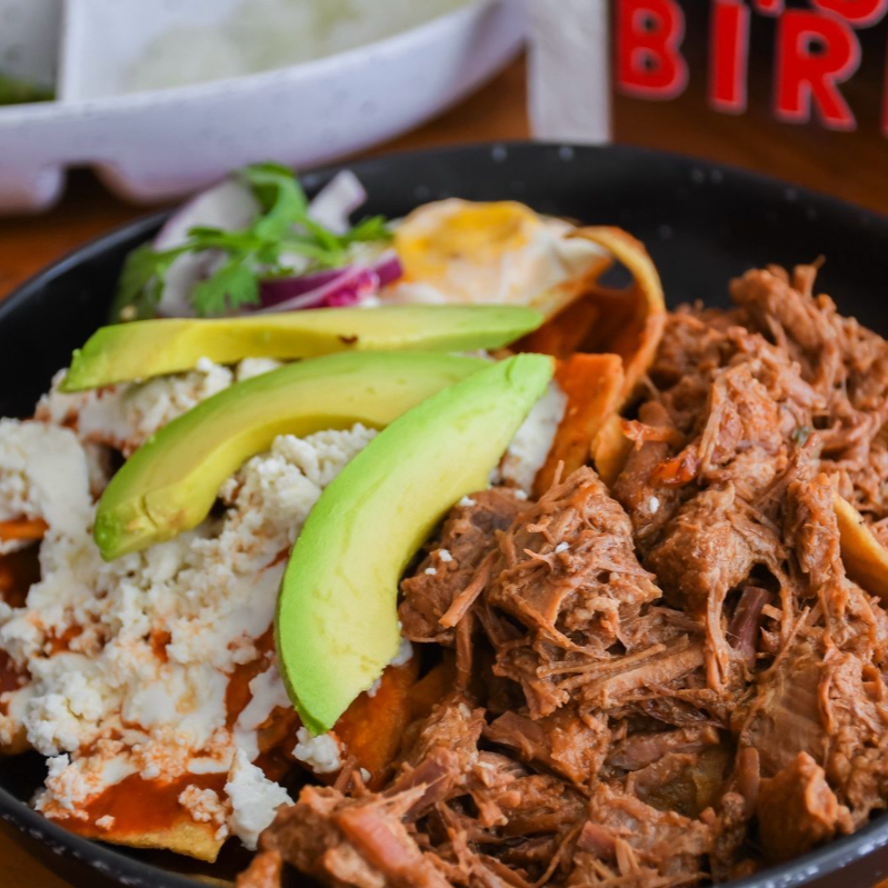 Chilaquiles rojos con birria y huevo al gusto.