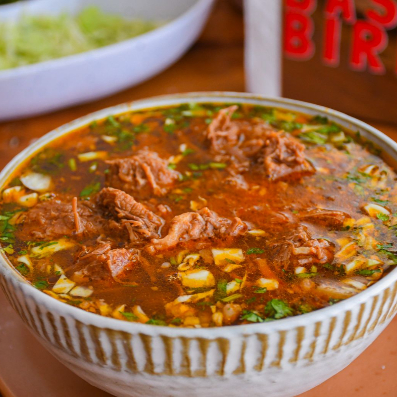 Rica birria de res, acompañada de tortillas hechas a mano y nuestras salsas especiales de la casa.
