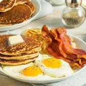 2 Pancakes acompañados con, 3 huevos, tocino, jamon, papa hashbrown y salchicha
