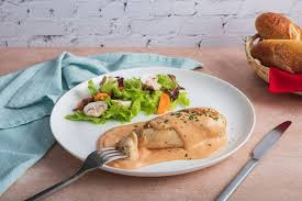 Crepa rellena de queso monterrey y pechuga en aderezo chipotle, acompañada de una guarnicion de ensalada.