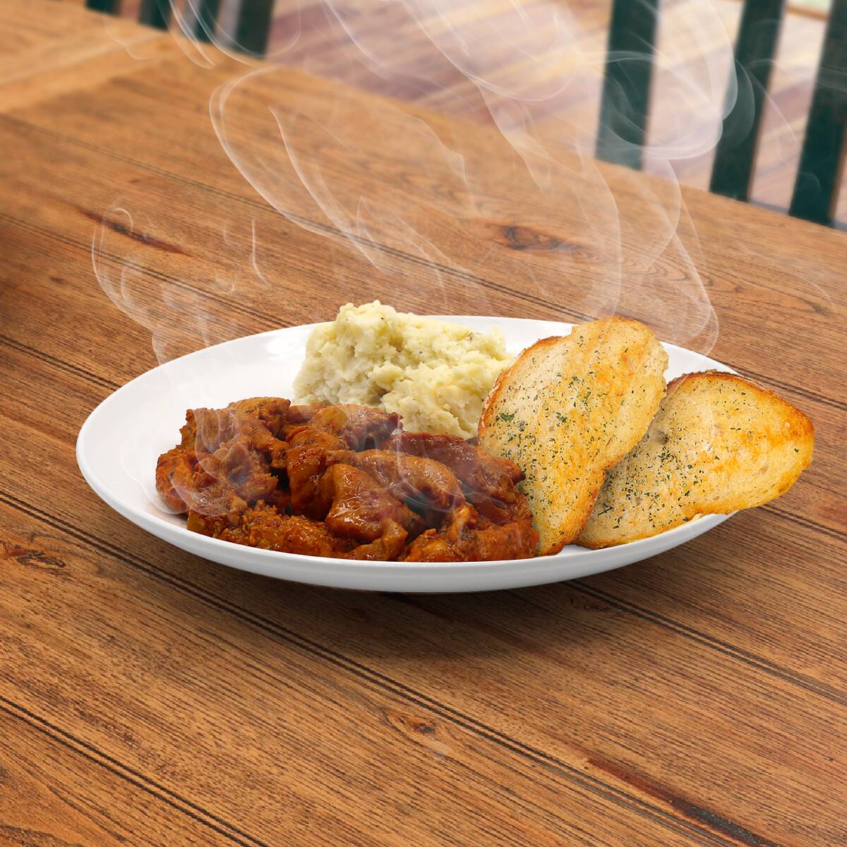 Trozos de pollo con papas guisados en nuestra irresistible salsa BBQ artesanal acompañado de pure de papa y pan con mantequilla.
