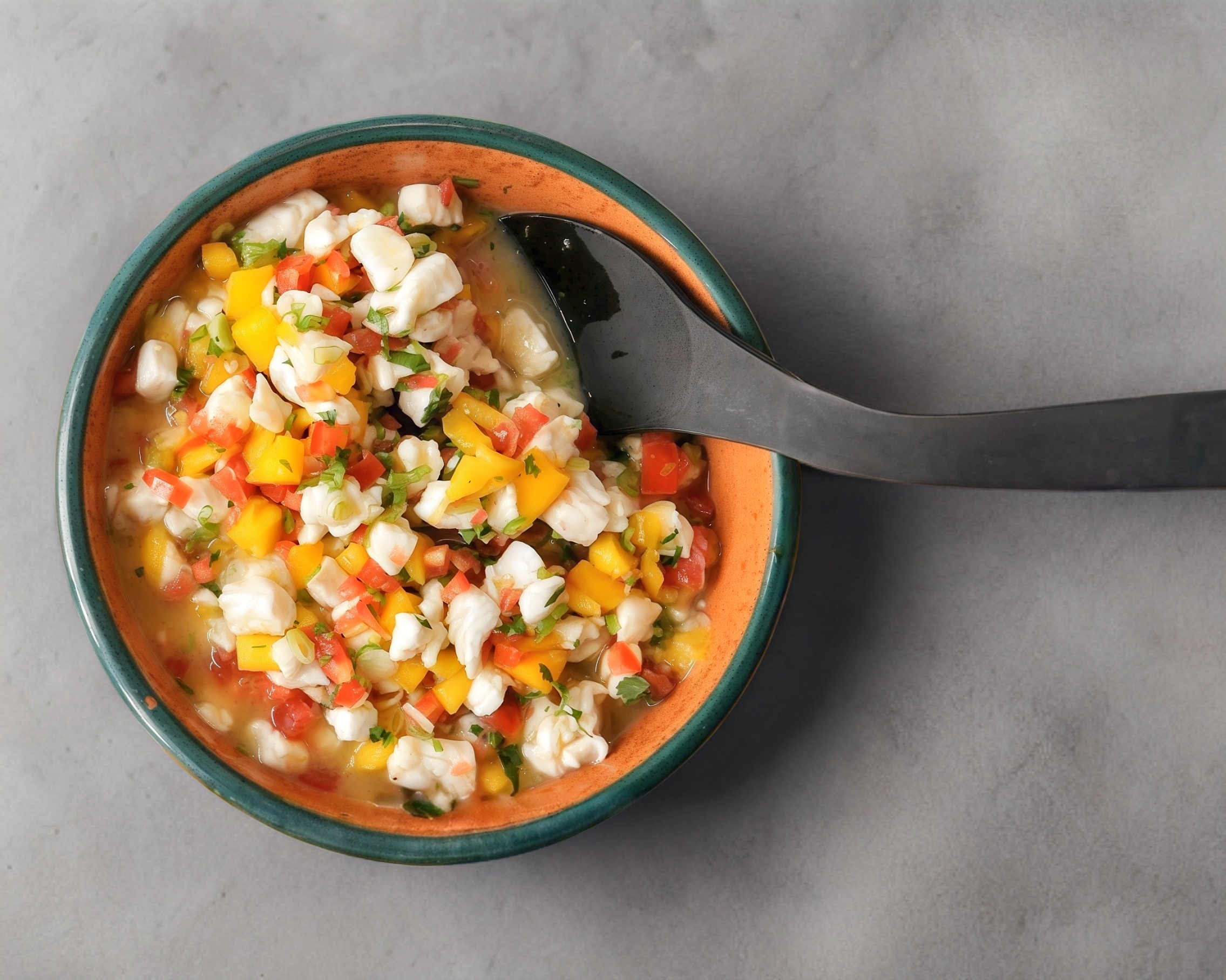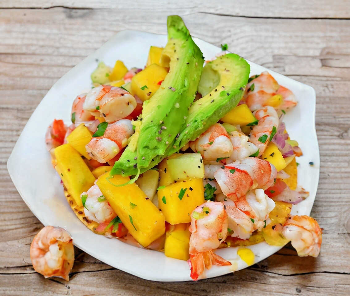 Una delicia de jitomate ,cebolla ,cilantro ,pepino por temporada mango y camaron en trozos en un clamato preparado