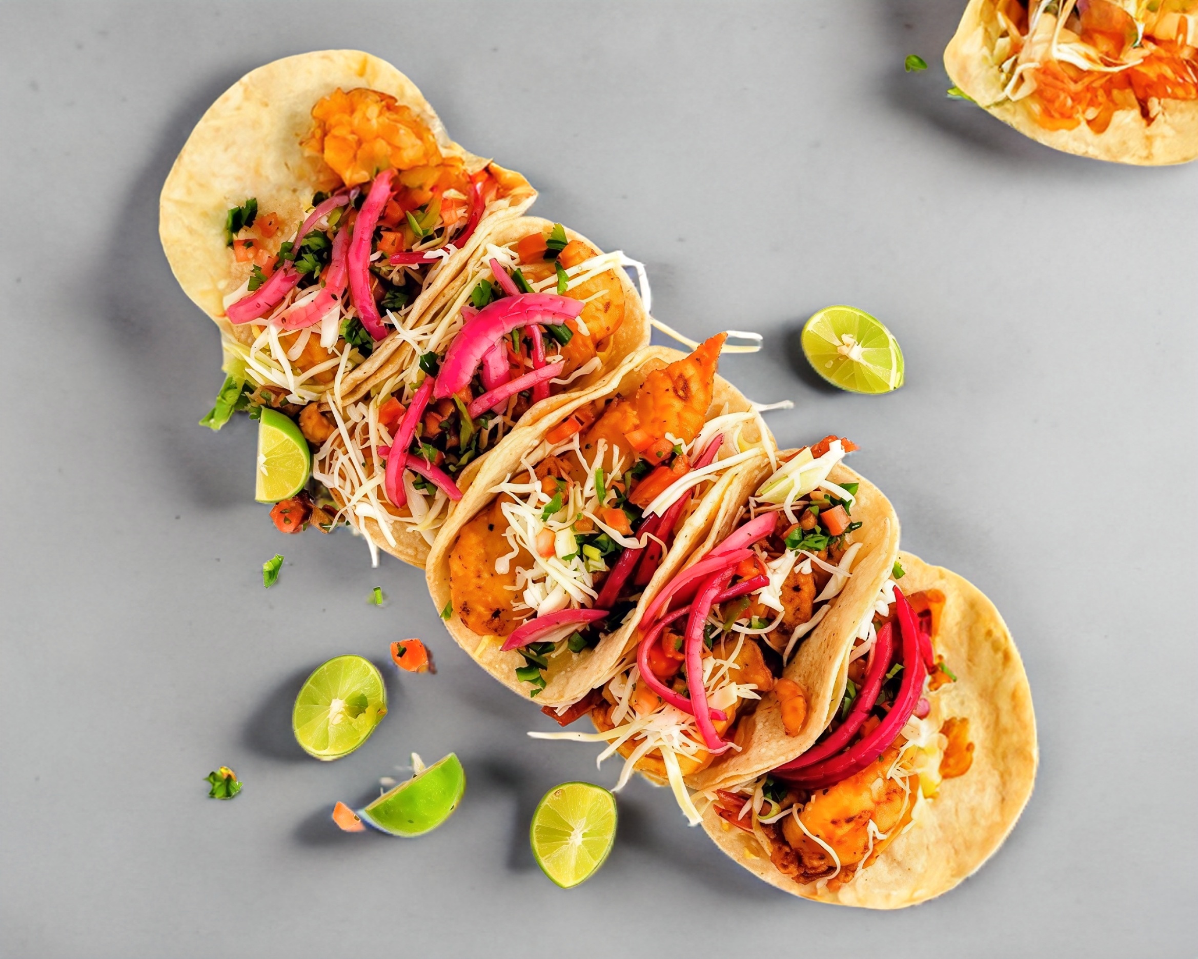 Camaron capeado en un torrilla de maiz acompañado de salsa bandera ,ensalada de repollo , y aderezo chipotle