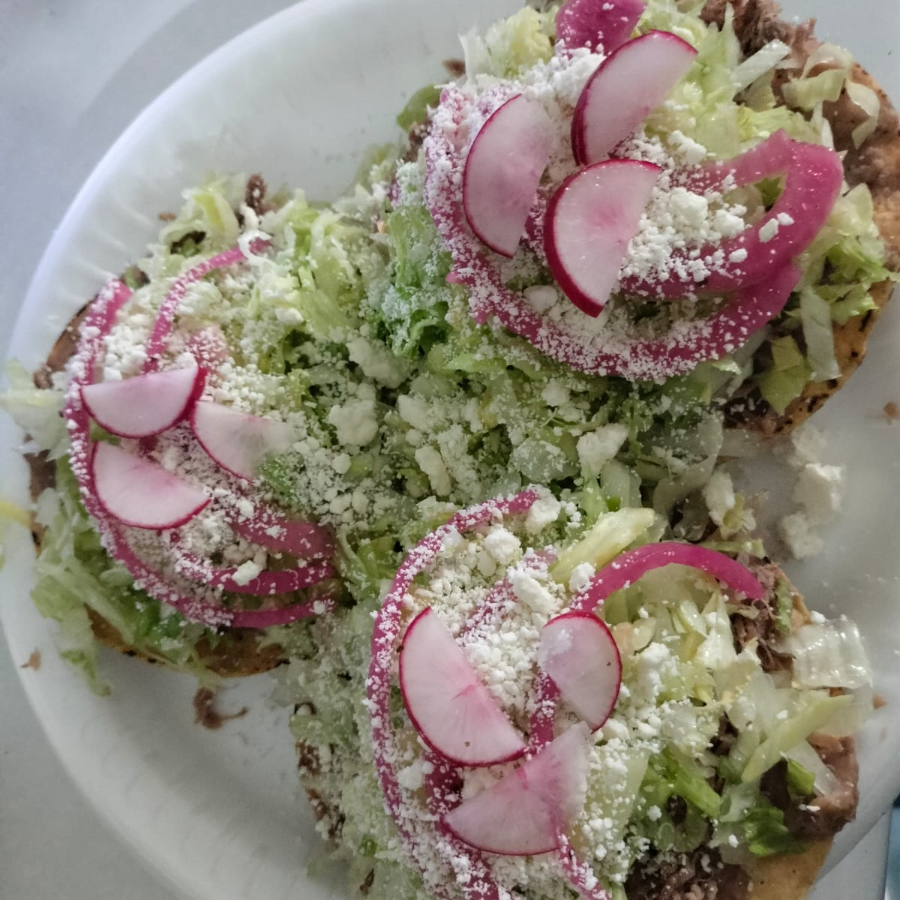 3 sopes con frijol, dehebrada, lechuga, rabanito, pepino, quesito, crema y jugo de tomate